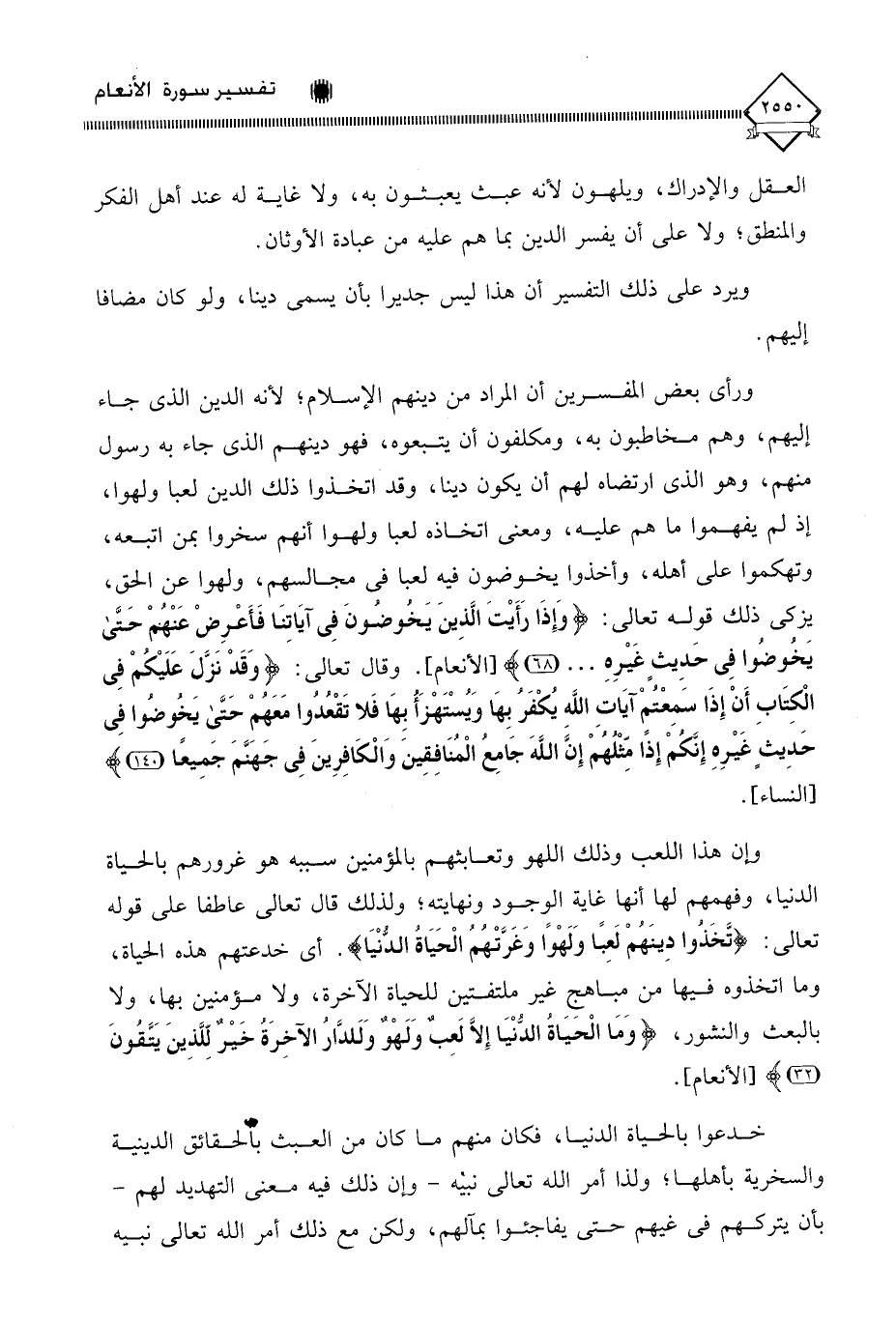 ورأى بعض المفسرين أن المراد من دينهم الإسلام؛ لأنه الدين الذي جاء إليهم، وهم مخاطبون به، ومكلفون أن يتبعوه، فهو دينهم الذي جاء به رسول منهم، وهو الذي ارتضاه لهم أن يكون دينا، وقد اتخذوا ذلك الدين لعبا ولهوا، إذ لم يفهموا ما هم عليه، ومعنى اتخاذه لعبا ولهوا أنهم سخروا بمن اتبعه، وتهكموا على أهله، وأخذوا يخوضون فيه لعبا في مجالسهم، ولهوا عن الحق، يزكي ذلك قوله تعالى: (وَإِذَا رَأَيْتَ الَّذِينَ يَخُوضونَ فِى آيَاتِنَا فَأَعْرِضْ عَنْهُمْ حَتَّى يَخُوضُوا فِى حَدِيثٍ غَيْرِهِ. . .). وقال تعالى: (وَقَدْ نَزَّلَ عَلَيْكُمْ فِي الْكِتَابِ أَنْ إِذَا سَمِعْتُمْ آيَاتِ اللَّهِ يُكْفَرُ بِهَا وَيُسْتَهْزَأُ بِهَا فَلَا تَقْعُدُوا مَعَهُمْ حَتَّى يَخُوضُوا فِي حَدِيثٍ غَيْرِهِ إِنَّكُمْ إِذًا مِثْلُهُمْ إِنَّ اللَّهَ جَامِعُ الْمُنَافِقِينَ وَالْكَافِرِينَ فِي جَهَنَّمَ جَمِيعًا (140).