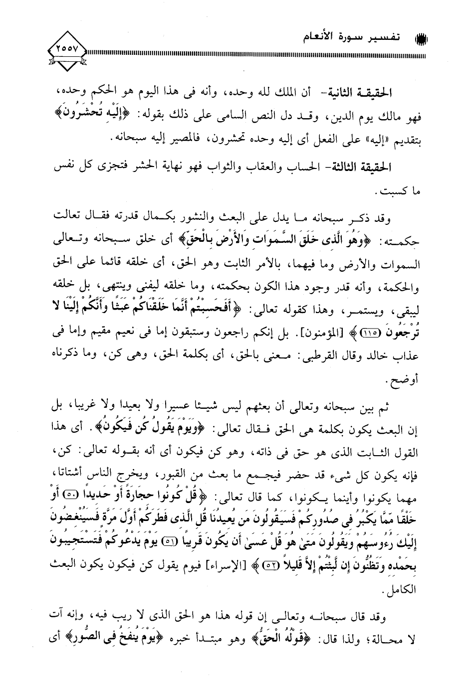 الحقيقة الثانية - أن الملك لله وحده، وأنه في هذا اليوم هو الحكم وحده، فهو مالك يوم الدين، وقد دل النص السامي على ذلك بقوله: (إِلَيْهِ تُحْشرونَ) بتقديم " إليه " على الفعل أي إليه وحده تحشرون، فالمصير إليه سبحانه.