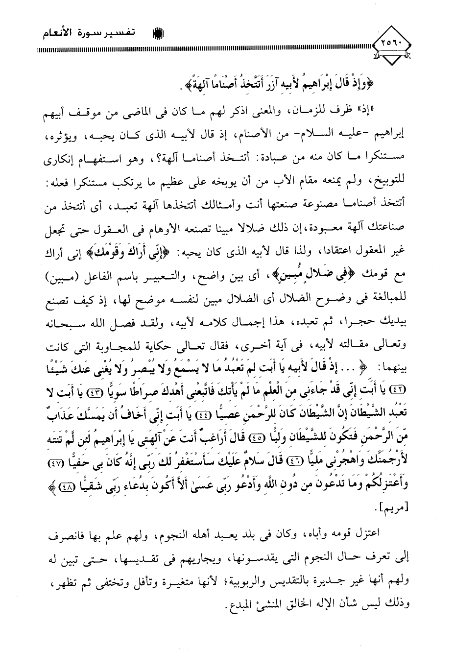 " إذ " ظرف للزمان، والمعنى اذكر لهم ما كان في الماضي من موقف أبيهم إبراهيم - عليه السلام - من الأصنام، إذ قال لأبيه الذي كان يحبه، ويؤثره، مستنكرا ما كان منه من عبادة: أتتخذ أصناما آلهة؛ وهو استفهام إنكاري للتوبيخ، ولم يمنعه مقام الأب من أن يوبخه على عظيم ما يرتكب مستنكرا فعله: أتتخذ أصناما مصنوعة صنعتها أنت وأمثالك أتتخذها آلهة تعبد، أي أتتخذ من صناعتك آلهة معبودة، إن ذلك ضلالا مبينا تصنعه الأوهام في العقول حتى تجعل غير المعقول اعتقادا، ولذا قال لأبيه الذي كان يحبه: (إِنِّى أَرَاكَ وَقَوْمَكَ) إني أراك مع قومك (فِى ضَلالٍ مُّبِينٍ)، أي بين واضح، والتعبير باسم الفاعل (مبين) للمبالغة في وضوح الضلال أي الضلال مبين لنفسه موضح لها، إذ كيف تصنع بيديك حجرا، ثم تعبده، هذا إجمال كلامه لأبيه، ولقد فصل الله سبحانه وتعالى مقالته لأبيه، في آية أخرى، فقال تعالى حكاية للمجاوبة التي كانت بينهما: (. . . إِذْ قَالَ لِأَبِيهِ يَا أَبَتِ لِمَ تَعْبُدُ مَا لَا يَسْمَعُ وَلَا يُبْصِرُ وَلَا يُغْنِي عَنْكَ شَيْئًا (42) يَا أَبَتِ إِنِّي قَدْ جَاءَنِي مِنَ الْعِلْمِ مَا لَمْ يَأْتِكَ فَاتَّبِعْنِي أَهْدِكَ صِرَاطًا سَوِيًّا (43) يَا أَبَتِ لَا تَعْبُدِ الشَّيْطَانَ إِنَّ الشَّيْطَانَ كَانَ لِلرَّحْمَنِ عَصِيًّا (44) يَا أَبَتِ إِنِّي أَخَافُ أَنْ يَمَسَّكَ عَذَابٌ مِنَ الرَّحْمَنِ فَتَكُونَ لِلشَّيْطَانِ وَلِيًّا (45) قَالَ أَرَاغِبٌ أَنْتَ عَنْ آلِهَتِي يَا إِبْرَاهِيمُ لَئِنْ لَمْ تَنْتَهِ لَأَرْجُمَنَّكَ وَاهْجُرْنِي مَلِيًّا (46) قَالَ سَلَامٌ عَلَيْكَ سَأَسْتَغْفِرُ لَكَ رَبِّي إِنَّهُ كَانَ بِي حَفِيًّا (47) وَأَعْتَزِلُكُمْ وَمَا تَدْعُونَ مِنْ دُونِ اللَّهِ وَأَدْعُو رَبِّي عَسَى أَلَّا أَكُونَ بِدُعَاءِ رَبِّي شَقِيًّا (48).