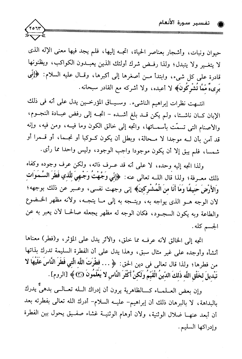 حيوان ونبات، وأشجار بعناصر الحياة، اتجه إليها، فلم يجد فيها معنى الإله الذي لا يتغير ولا يتبدل؛ ولذا رفض شرك أولئك الذين يعبدون الكواكب، ويظنونها قادرة على كل شيء، وابتدأ من أصغرها إلى أكبرها، وقال عليه السلام: (إِنِّي بَرِيءٌ مِمَّا تُشْرِكُونَ) لَا أعبده، ولا أشركه مع القادر سبحانه.