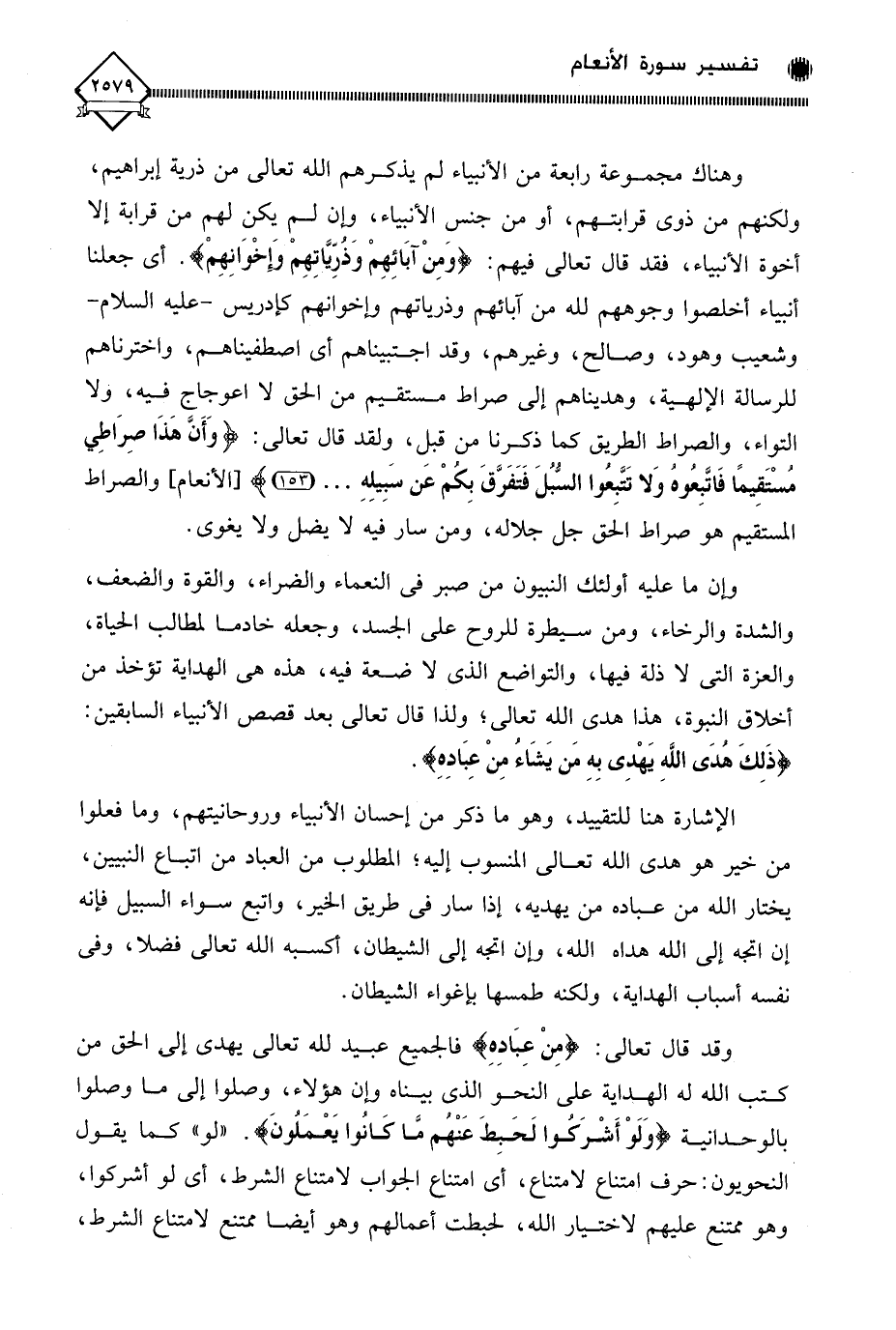 وقد قال تعالى: (مِنْ عِبَادِهِ) فالجميع عبيد لله تعالى يهدي إلى الحق من كتب الله له الهداية على النحو الذي بيناه وإن هؤلاء، وصلوا إلى ما وصلوا بالوحدانية (وَلَوْ أَشْرَكُوا لَحَبِطَ عَنْهم مَّا كَانُوا يَعْمَلُونَ). " لو " كما يقول النحويون: حرف امتناع لامتناع، أي امتناع الجواب لامتناع الشرط، أي لو أشركوا، وهو ممتنع عليهم لاختيار الله، لحبطت أعمالهم وهو أيضا ممتنع لامتناع الشرط،