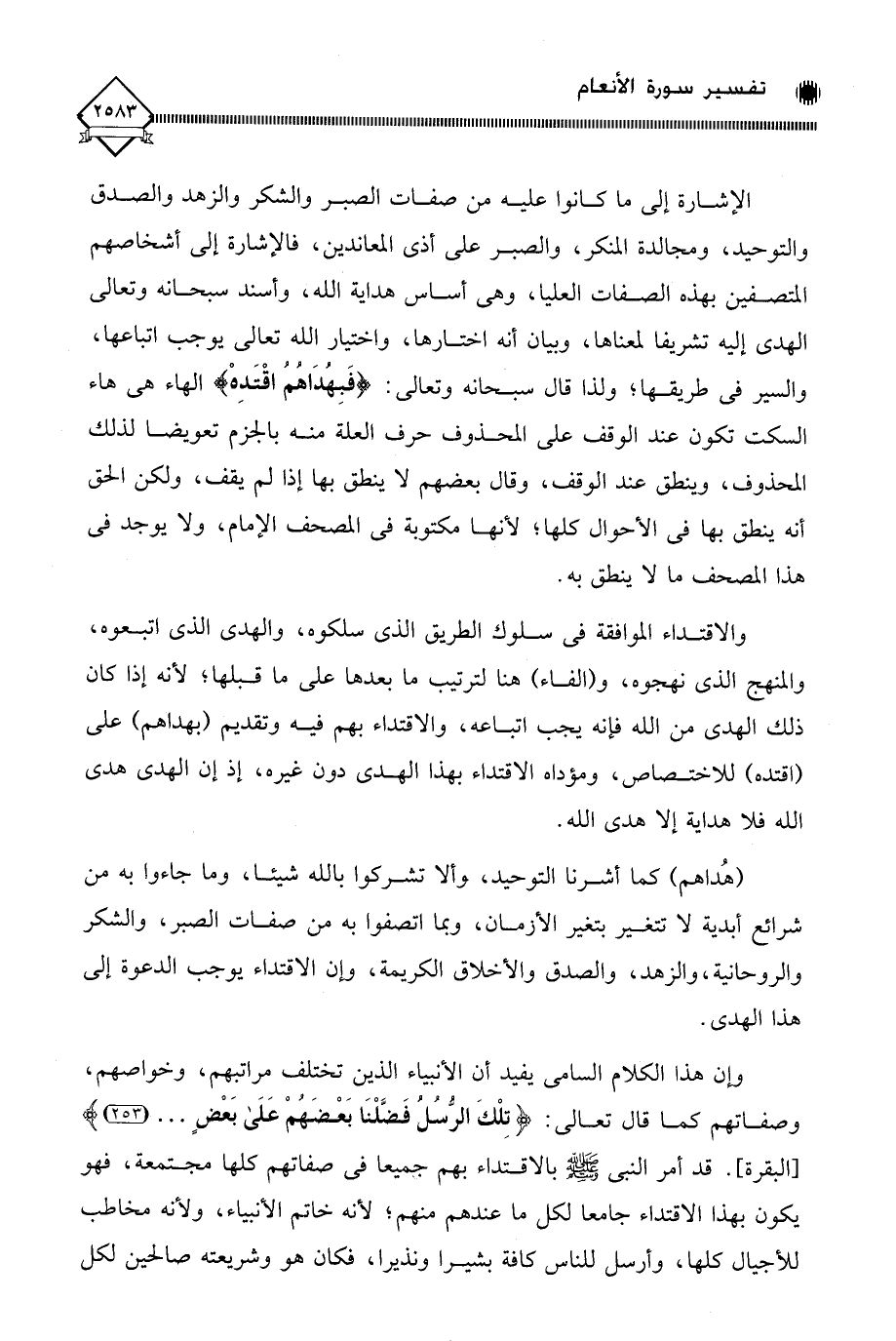 (هُداهم) كما أشرنا التوحيد، وألا تشركوا بالله شيئا، وما جاءوا به من شرائع أبدية لَا تتغير بتغير الأزمان، وبما اتصفوا به من صفات الصبر، والشكر والروحانية، والزهد، والصدق والأخلاق الكريمة، وإن الاقتداء يوجب الدعوة إلى هذا الهدى.