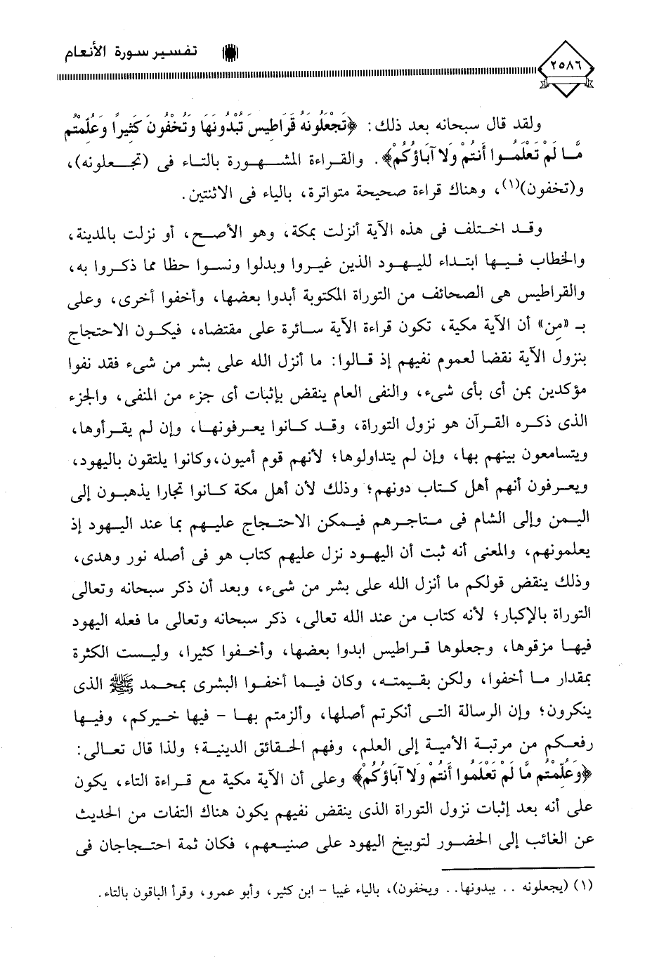 ولقد قال سبحانه بعد ذلك: (تَجْعَلُونَهُ قَرَاطِيسَ تُبْدُونَهَا وَتُخْفُونَ كَثِيرًا وَعُلِّمْتُمْ مَا لَمْ تَعْلَمُوا أَنْتُمْ وَلَا آبَاؤُكُمْ). والقراءة المشهورة بالتاء في (تجعلونه)، و (تخفون) (¬1)، وهناك قراءة صحيحة متواترة، بالياء في الاثنتين.