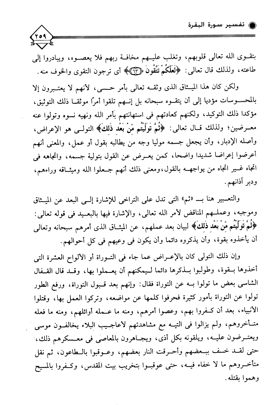 وإن ذلك التولي كان بالإعراض عما جاء في التوراة أو الألواح العشرة التي أخذوها بقوة، وطولبوا بذكرها دائما ليمكنهم أن يعملوا بها، وقد قال القفال الشاسي بعض ما تولوا به عن التوراة فقال: وإنهم بعد قبول التوراة، ورفع الطور تولوا عن التوراة بأمور كثيرة فحرفوا كلمها عن مواضعه، وتركوا العمل بها، وقتلوا الأنبياء، بعد أن كفروا بهم، وعصوا أمرهم، ومنه ما عمله أوائلهم، ومنه ما فعله متأخروهم، ولم يزالوا في التيه مع مشاهدتهم لأعاجيب البلاء يخالفون موسى ويعترضون عليه، ويلقونه بكل أذى، ويجاهرون بالمعاصي في معسكرهم ذلك، حتى لقد خسف ببعضهم وأحرقت النار بعضهم، وعوقبوا بالطاعون، ثم نقل متأخروهم ما لَا خفاء فيه، حتى عوقبوا بتخريب بيت المقدس، وكفروا بالمسيح وهموا بقتله.