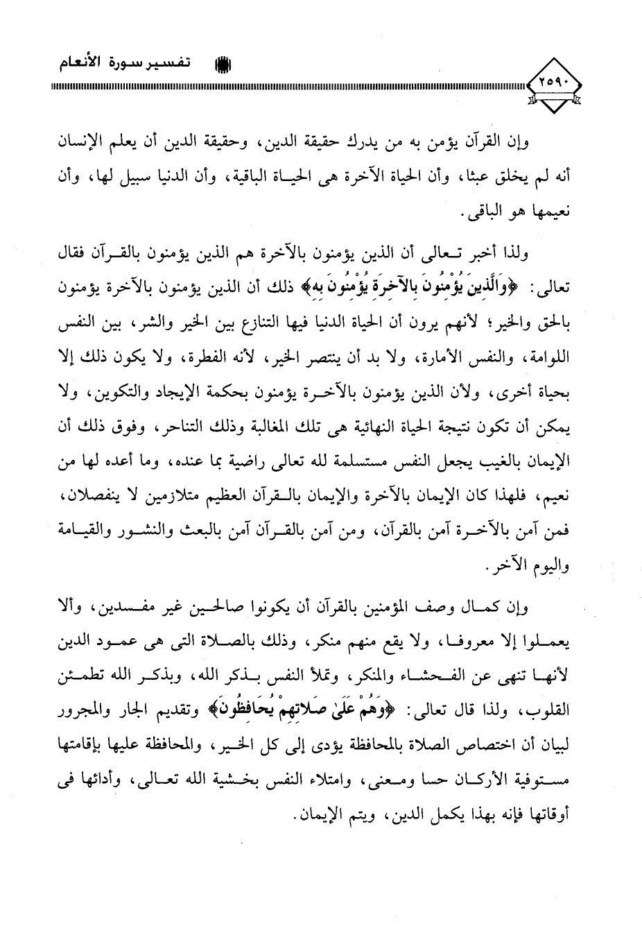 ولذا أخبر تعالى أن الذين يؤمنون بالآخرة هم الذين يؤمنون بالقرآن فقال تعالى: (وَالَّذِينَ يُؤْمِنُونَ بِالآخِرَةِ يُؤْمِنونَ بِهِ) ذلك أن الذين يؤمنون بالآخرة يؤمنون بالحق والخير؛ لأنهم يرون أن الحياة الدنيا فيها التنازع بين الخير والشر، بين النفس اللوامة، والنفس الأمارة، ولا بد أن ينتصر الخير، لأنه الفطرة، ولا يكون ذلك إلا بحياة أخرى، ولأن الذين يؤمنون بالآخرة يؤمنون بحكمة الإيجاد والتكوين، ولا يمكن أن تكون نتيجة الحياة النهائية هي تلك المغالبة وذلك التناحر، وفوق ذلك أن الإيمان بالغيب يجعل النفس مستسلمة لله تعالى راضية بما عنده، وما أعده لها من نعيم، فلهذا كان الإيمان بالآخرة والإيمان بالقرآن العظيم متلازمين لَا ينفصلان، فمن آمن بالآخرة آمن بالقرآن، ومن آمن بالقرآن آمن بالبعث والنشور والقيامة واليوم الآخر.