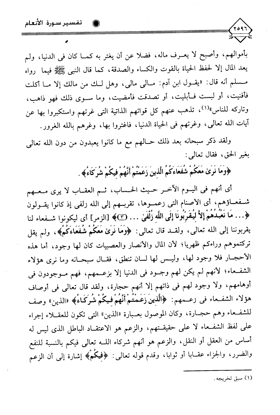أي أنهم في اليوم الآخر حيث الحساب، ثم العقاب لَا يرى معهم شفعاؤهم، أي الأصنام التي زعموها، تقربهم إلى الله زلفى إذ كانوا يقولون (. . . مَا نَعْبُدُهُمْ إِلَّا لِيُقَرِّبُونَا إِلَى اللَّهِ زُلْفَى ... )، أي ليكونوا شفعاء لنا يقربوننا إلى الله تعالى، ولقد قال تعالى: (وَمَا نَرَى مَعَكُمْ شُفَعَاءَكُمُ)، ولم يقل تركتموهم وراءكم ظهريا؛ لأن المال والأنصار والعصبيات كان لها وجود، أما هذه الأحجار فلا وجود لها، وليس لها لسان تنطق، فقال سبحانه وما نرى هؤلاء الشفعاء؛ لأنهم لم يكن لهم وجود في الدنيا إلا بزعمهم، فهم موجودون في أوهامهم، ولا وجود لهم في ذاتهم إلا أنهم حجارة، ولقد قال تعالى في أوصاف هؤلاء الشفعاء في زعمهم: (الَّذِينَ زَعَمْتمْ أَنَّهُمْ فِيكمْ شرَكَاء) " الذين " وصف للشفعاء وهم حجارة، وكان الموصول بعبارة " الذين " التي تكون للعقلاء إجراء على لفظ الشفعاء لَا على حقيقتهم، والزعم هو الاعتقاد الباطل الذي ليس له أساس من العقل أو النقل، والزعم هو أنهم شركاء الله تعالى فيكم بالنسبة للنفع والضرر، والجزاء عقابا أو ثوابا، وقدم قوله تعالى: (فِيكُمْ) إشارة إلى أن الزعم