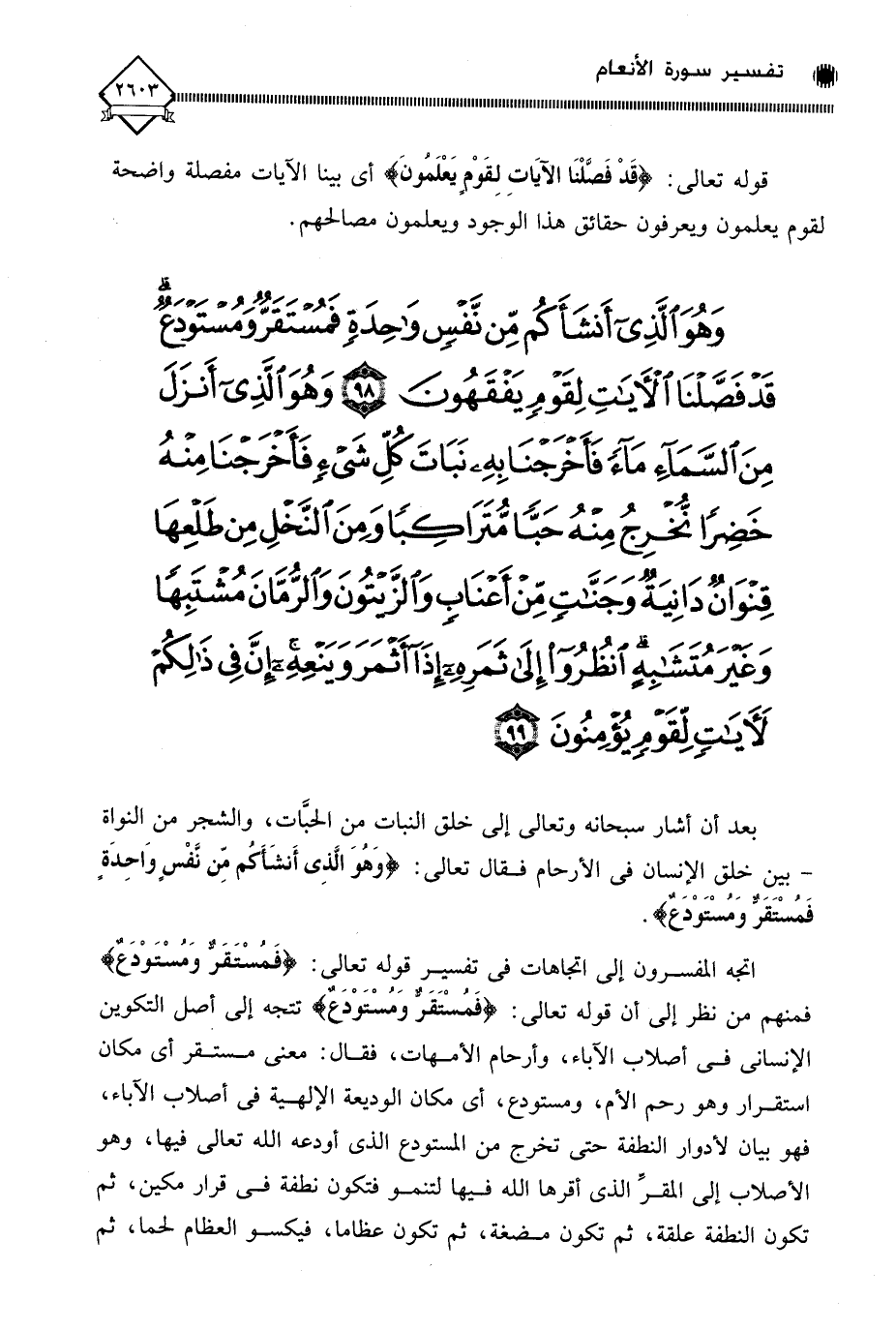 (وَهُوَ الَّذِي أَنْشَأَكُمْ مِنْ نَفْسٍ وَاحِدَةٍ فَمُسْتَقَرٌّ وَمُسْتَوْدَعٌ قَدْ فَصَّلْنَا الْآيَاتِ لِقَوْمٍ يَفْقَهُونَ (98) وَهُوَ الَّذِي أَنْزَلَ مِنَ السَّمَاءِ مَاءً فَأَخْرَجْنَا بِهِ نَبَاتَ كُلِّ شَيْءٍ فَأَخْرَجْنَا مِنْهُ خَضِرًا نُخْرِجُ مِنْهُ حَبًّا مُتَرَاكِبًا وَمِنَ النَّخْلِ مِنْ طَلْعِهَا قِنْوَانٌ دَانِيَةٌ وَجَنَّاتٍ مِنْ أَعْنَابٍ وَالزَّيْتُونَ وَالرُّمَّانَ مُشْتَبِهًا وَغَيْرَ مُتَشَابِهٍ انْظُرُوا إِلَى ثَمَرِهِ إِذَا أَثْمَرَ وَيَنْعِهِ إِنَّ فِي ذَلِكُمْ لَآيَاتٍ لِقَوْمٍ يُؤْمِنُونَ (99)