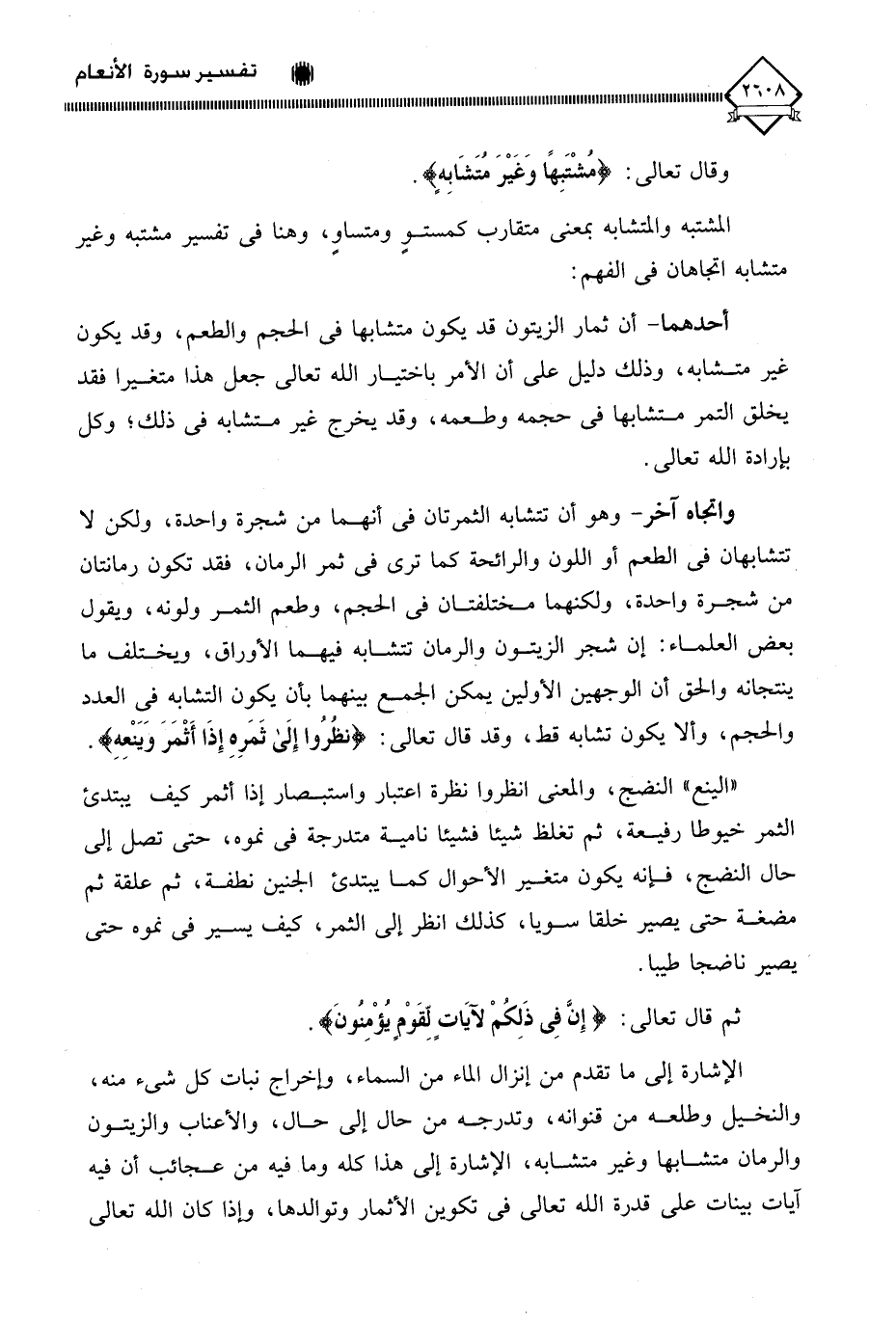 واتجاه آخر - وهو أن تتشابه الثمرتان في أنهما من شجرة واحدة، ولكن لا تتشابهان في الطعم أو اللون والرائحة كما ترى في ثمر الرمان، فقد تكون رمانتان من شجرة واحدة، ولكنهما مختلفتان في الحجم، وطعم الثمر ولونه، ويقول بعض العلماء: إن شجر الزيتون والرمان تتشابه فيهما الأوراق، ويختلف ما ينتجانه والحق أن الوجهين الأولين يمكن الجمع بينهما بأن يكون التشابه في العدد والحجم، وألا يكون تشابه قط، وقد قال تعالى: (نظُرُوا إِلَى ثَمَرِهِ إِذَا أَثْمَرَ وَيَنْعِهِ).