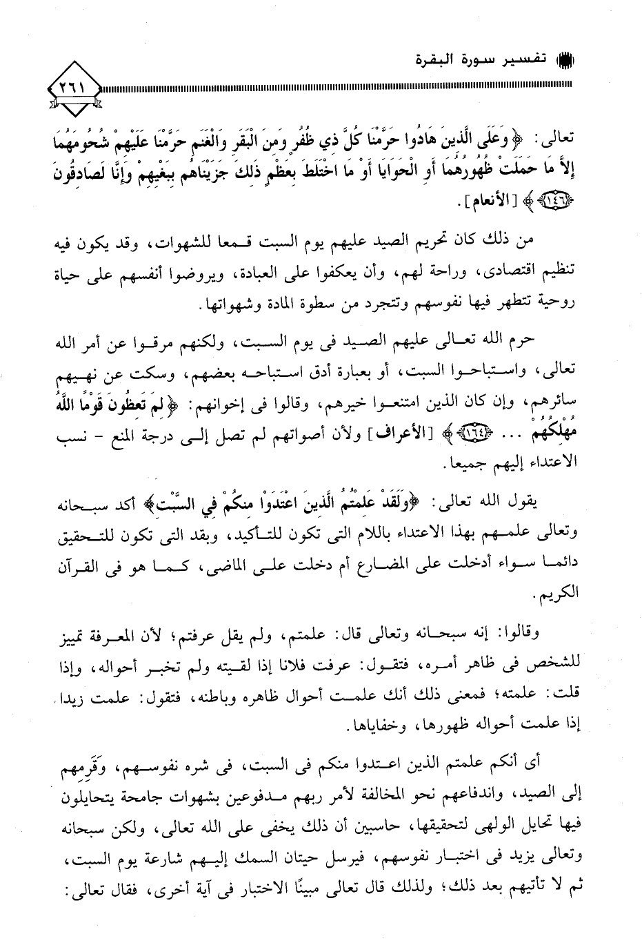 من ذلك كان تحريم الصيد عليهم يوم السبت قمعا للشهوات، وقد يكون فيه تنظيم اقتصادي، وراحة لهم، وأن يعكفوا على العبادة، ويروضوا أنفسهم على حياة روحية تتطهر فيها نفوسهم وتتجرد من سطوة المادة وشهواتها.