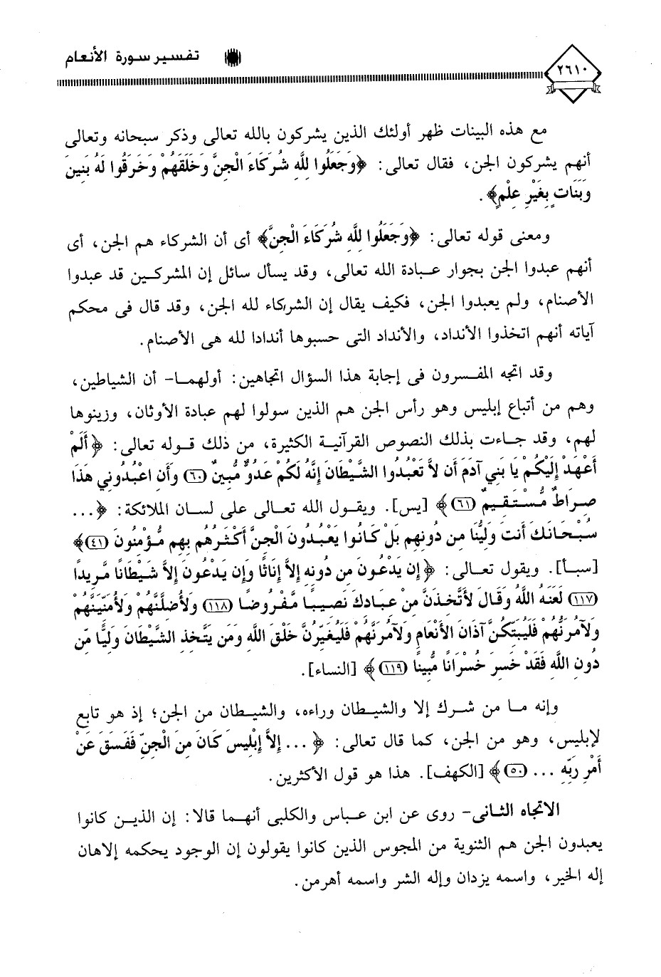 ويقول تعالى: (إِنْ يَدْعُونَ مِنْ دُونِهِ إِلَّا إِنَاثًا وَإِنْ يَدْعُونَ إِلَّا شَيْطَانًا مَرِيدًا (117) لَعَنَهُ اللَّهُ وَقَالَ لَأَتَّخِذَنَّ مِنْ عِبَادِكَ نَصِيبًا مَفْرُوضًا (118) وَلَأُضِلَّنَّهُمْ وَلَأُمَنِّيَنَّهُمْ وَلَآمُرَنَّهُمْ فَلَيُبَتِّكُنَّ آذَانَ الْأَنْعَامِ وَلَآمُرَنَّهُمْ فَلَيُغَيِّرُنَّ خَلْقَ اللَّهِ وَمَنْ يَتَّخِذِ الشَّيْطَانَ وَلِيًّا مِنْ دُونِ اللَّهِ فَقَدْ خَسِرَ خُسْرَانًا مُبِينًا (119). وإنه ما من شرك إلا والشيطان وراءه، والشيطان من الجن؛ إذ هو تابِع لإبليس، وهو من الجن، كما قال تعالى: (. . . إِلَّا إِبْلِيسَ كَانَ مِنَ الْجِنِّ فَفَسَقَ عن أَمْرِ رَبِّهِ. . .). هذا هو قول الأكثرين.