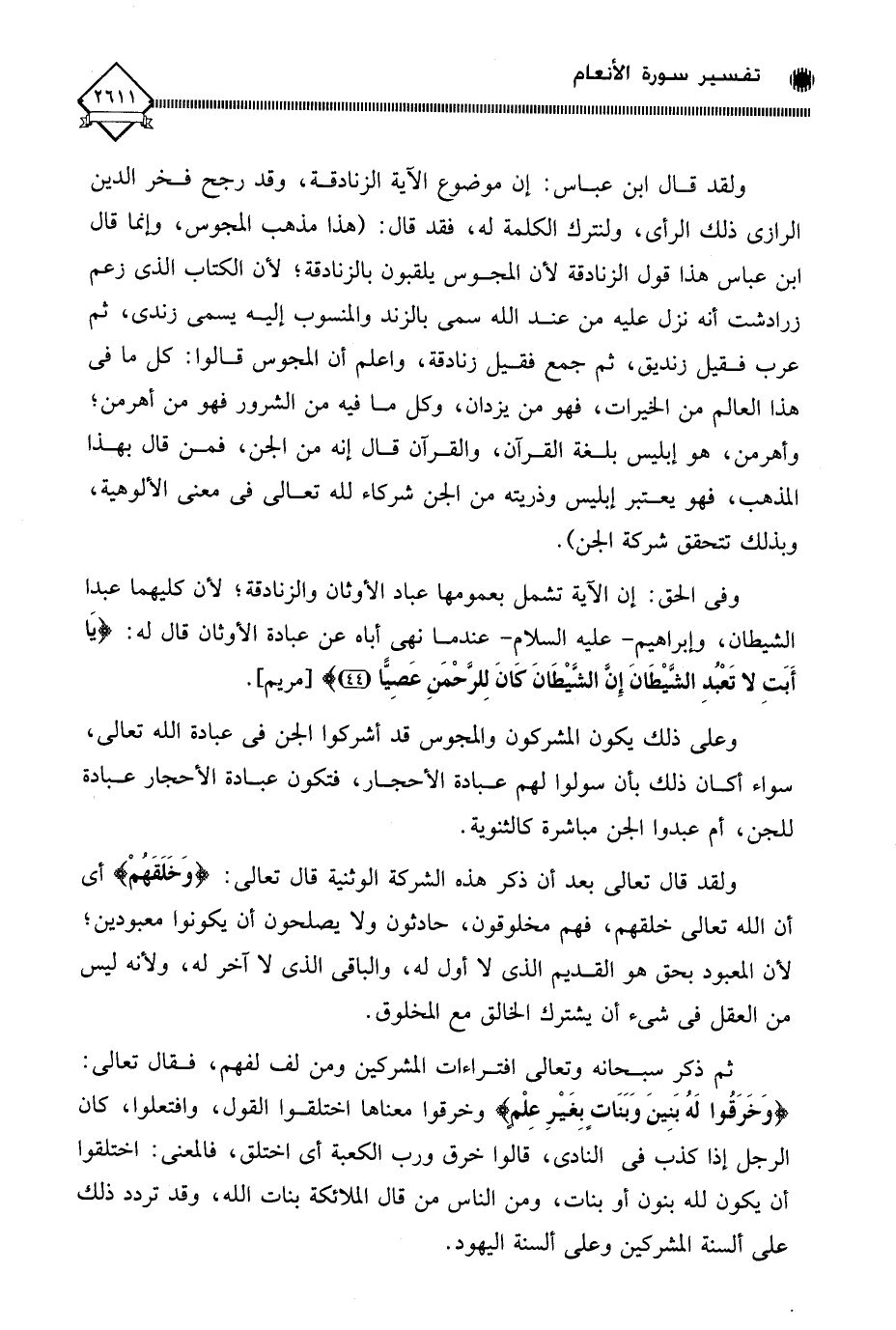 ولقد قال ابن عباس: إن موضوع الآية الزنادقة، وقد رجح فخر الدين الرازي ذلك الرأي، ولنترك الكلمة له، فقد قال: (هذا مذهب المجوس، وإنما قال ابن عباس هذا قول الزنادقة لأن المجوس يلقبون بالزنادقة، لأن الكتاب الذي زعم زرادشت أنه نزل عليه من عند الله سمى بالزند والمنسوب إليه يسمى زندي، ثم عرب فقيل زنديق، ثم جمع فقيل زنادقة، واعلم أن المجوس قالوا: كل ما في هذا العالم من الخيرات، فهو من يزدان، وكل ما فيه من الشرور فهو من أهرمن، وأهرمن، هو إبليس بلغة القرآن، والقرآن قال إنه من الجن، فمن قال بهذا المذهب، فهو يعقبر إبليس وذريته من الجن شركاء لله تعالى في معنى الألوهية، وبذلك تتحقق شركة الجن).