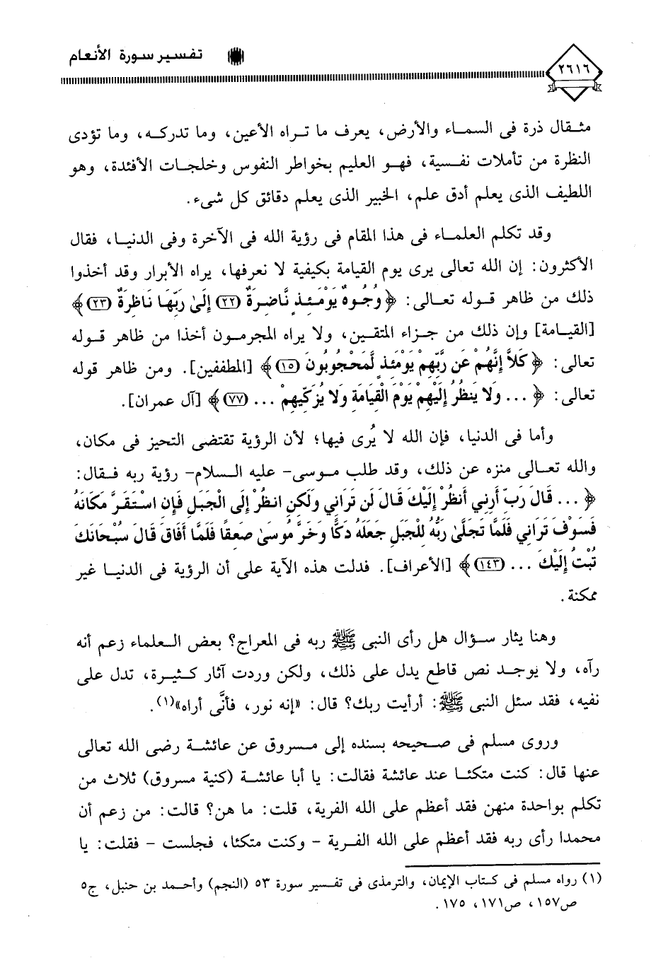 وقد تكلم العلماء في هذا المقام في رؤية الله في الآخرة وفي الدنيا، فقال الأكثرون: إن الله تعالى يرى يوم القيامة بكيفية لَا نعرفها، يراه الأبرار وقد أخذوا ذلك من ظاهر قوله تعالى: (وُجُوهٌ يَوْمَئِذ نَّاضِرَةٌ إِلَى رَبِّهَا نَاظِرَةٌ)، وإن ذلك من جزِاء المتقين، ولا يراه المجرمون أخذا من ظاهر قوله تعالى: (كَلَّا إِنَّهُمْ عَن رَّبِّهِمْ يوْمَئِذٍ لَّمَحْجُوبُونَ). ومن ظاهر قوله تعالى: (. . . وَلا يَنظُرُ إِلَيْهِمْ يَوْمَ الْقِيَامَةِ وَلا يُزَكيهِمْ. . .).