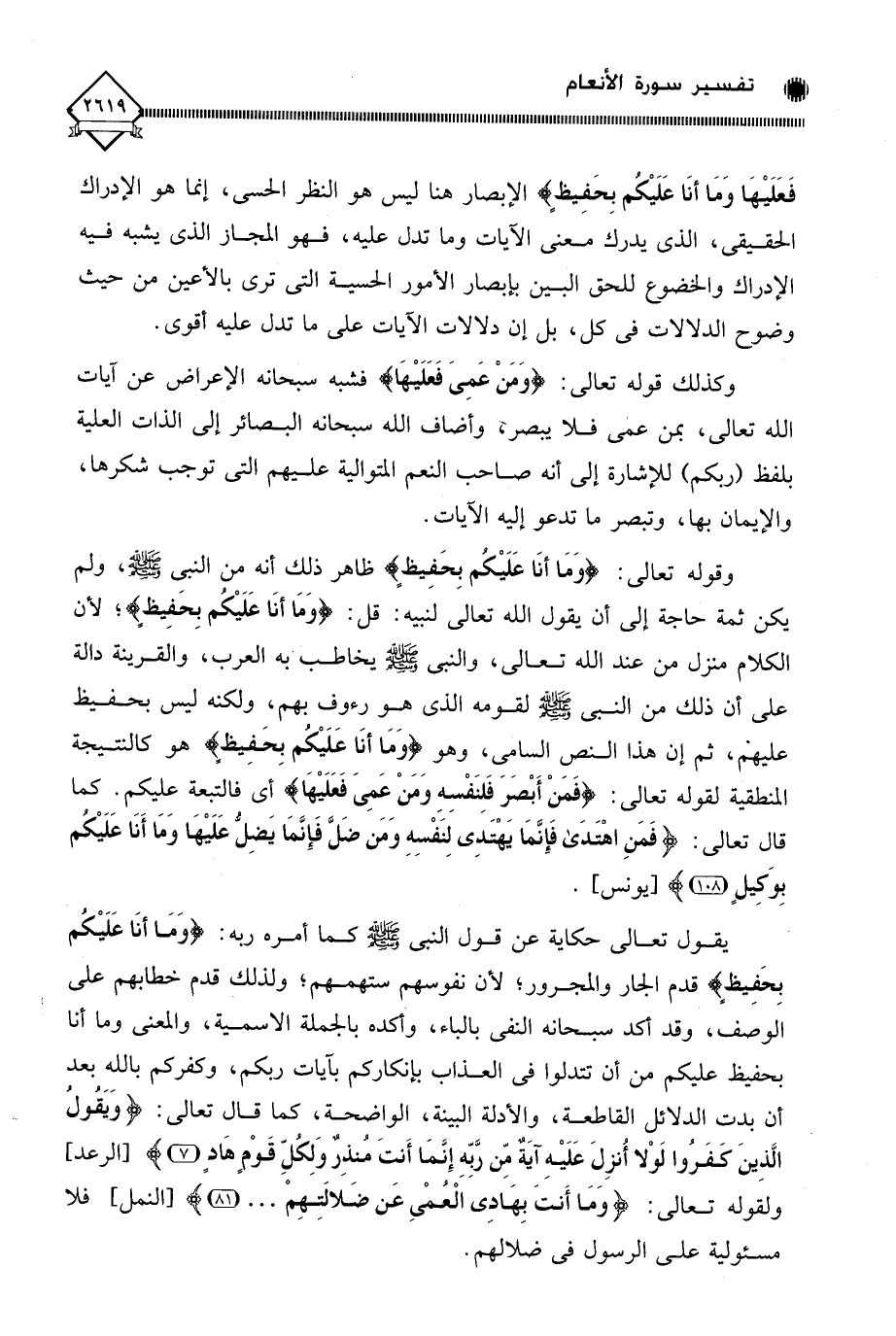 وقوله تعالى: (وَمَا أنَا عَلَيْكُم بِحَفِيظ) ظاهر ذلك أنه من النبي - صلى الله عليه وسلم -، ولم يكن ثمة حاجة إلى أن يقول الله تعالى لنبيه - صلى الله عليه وسلم -: (وَمَا أنَا عَلَيْكم بِحَفِيظ)؛ لأن الكلام منزل من عند الله تعالى، والنبي - صلى الله عليه وسلم - يخاطب به العرب، والقرينة دالة على أن ذلك من النبي - صلى الله عليه وسلم - لقومه الذي هو رءوف بهم، ولكنه ليس بحفيظ عليهم، ثم إن هذا النص السامي، وهو (وَمَا أنَا عَلَيْكُم بِحَفِيظ) هو كالنتيجة المنطقية لقوله تعالى: (فَمَنْ أَبْصَرَ فَلِنَفْسِهِ وَمَنْ عَمِي فَعَلَيْهَا) أي فالتبعة عليكم كما قال تعالى: (فَمَنِ اهْتَدَى فَإِنَّمَا يَهْتَدِى لِنَفْسِهِ وَمَن ضَلَّ فَإِنَّمَا يَضِلُّ عَلَيْهَا وَمَا أَنَا عَلَيْكُم بِوَكِيلٍ).