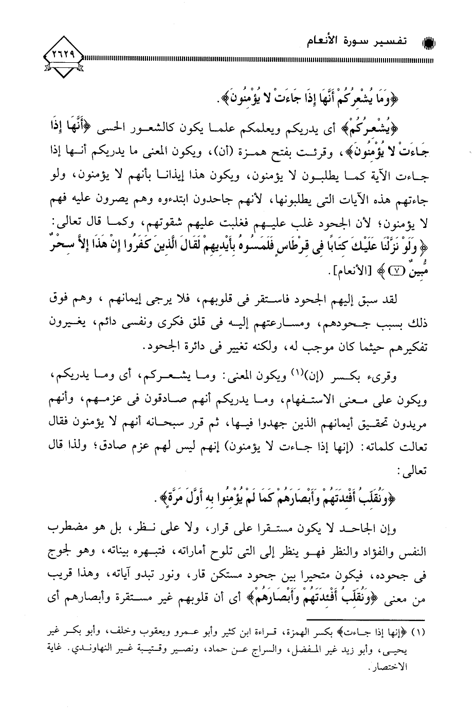 (¬1) (إنها إذا جاءت) بكسر الهمزة، قراءة ابن كثير وأبو عمرو ويعقوب وخلف، وأبو بكر غير يحيى، وأبو زيد غير الفضل، والسراج عن حماد، ونصير وقتيبة غير النهاوندي. غاية الاختصار.
