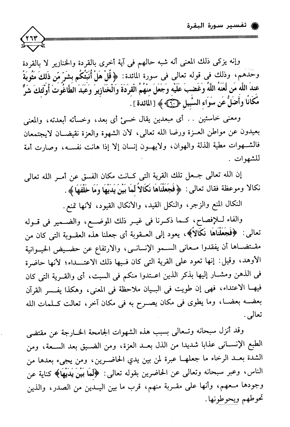 وإنه يزكي ذلك المعنى أنه شبه حالهم في آية أخرى بالقردة والخنازير لَا بالقردة وحدهم، وذلك في قوله تعالى في سورة المائدة: (قُلْ هَلْ أُنَبِّئُكُمْ بِشَرٍّ مِنْ ذَلِكَ مَثُوبَةً عِنْدَ اللَّهِ مَنْ لَعَنَهُ اللَّهُ وَغَضِبَ عَلَيْهِ وَجَعَلَ مِنْهُمُ الْقِرَدَةَ وَالْخَنَازِيرَ وَعَبَدَ الطَّاغُوتَ أُولَئِكَ شَرٌّ مَكَانًا وَأَضَلُّ عَنْ سَوَاءِ السَّبِيلِ (60).