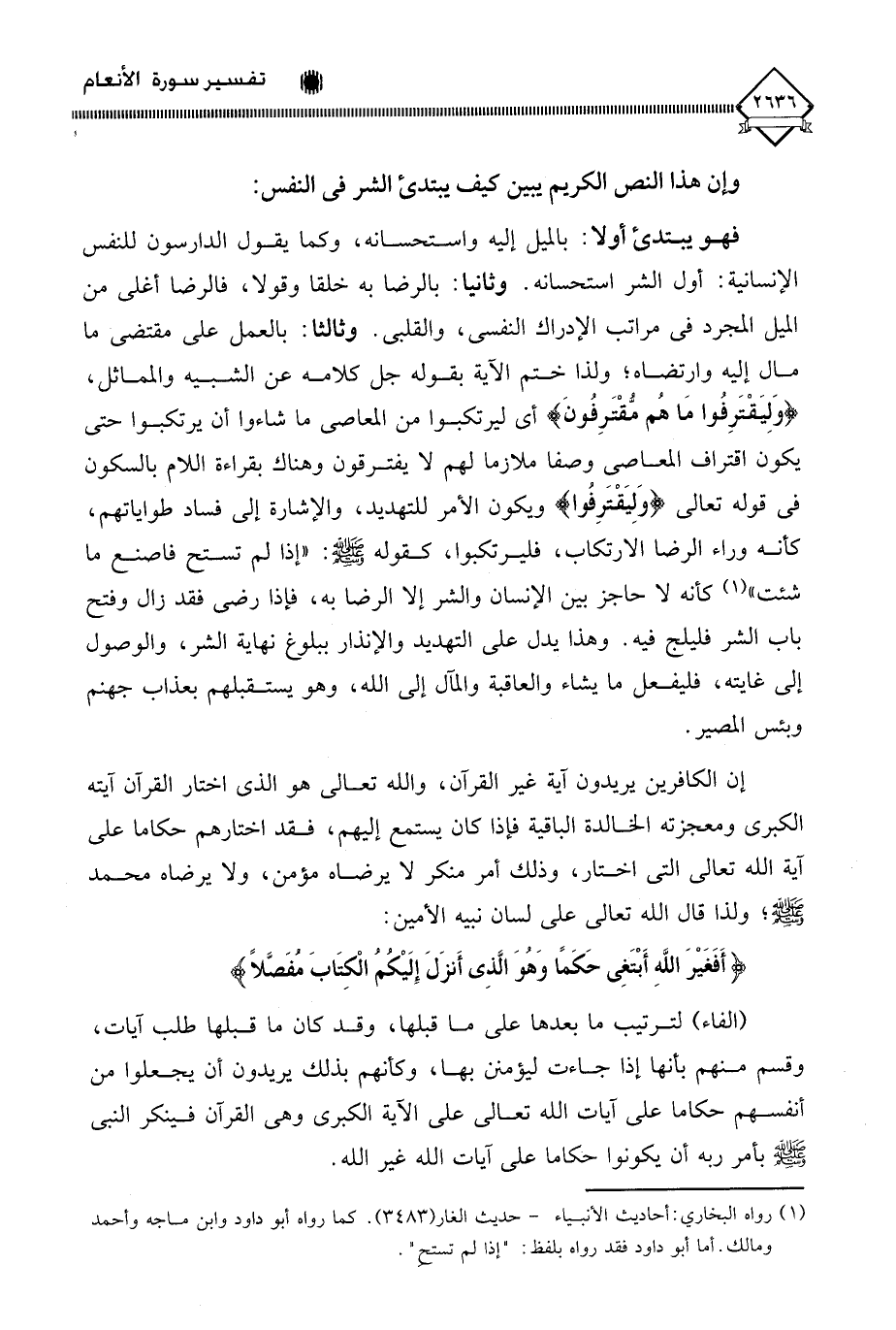 فهو يبتدئ أولا: بالميل إليه واستحسانه، وكما يقول الدارسون للنفس الإنسانية: أول الشر استحسانه. وثانيا: بالرضا به خلقا وقولا، فالرضا أعلى من الميل المجرد في مراتب الإدراك النفسي، والقلبي. وثالثا: بالعمل على مقتضى ما مال إليه وارتضاه؛ ولذا ختم الآية بقوله جل كلامه عن الشبيه والمماثل، (وَلِيَقْتَرِفُوا مَا هُم مُّقْتَرِفُونَ) أي ليرتكبوا من المعاصي ما شاءوا أن يرتكبوا حتى يكون اقتراف المعاصي وصفا ملازما لهم لَا يفترقون وهناك بقراءة اللام بالسكون في قوله تعالى (وَلِيَقْتَرِفُوا) ويكون الأمر للتهديد، والإشارة إلى فساد طواياتهم، كأنه وراء الرضا الارتكاب، فليرتكبوا، كقوله - صلى الله عليه وسلم -: " إذا لم تستح فاصنع ما شئت " (¬1) كأنه لَا حاجز بين الإنسان والشر إلا الرضا به، فإذا رضي فقد زال وفتح باب الشر فليلج فيه. وهذا يدل على التهديد والإنذار ببلوغ نهاية الشر، والوصول إلى غايته، فليفعل ما يشاء والعاقبة والمآل إلى الله، وهو يستقبلهم بعذاب جهنم وبئس المصير.