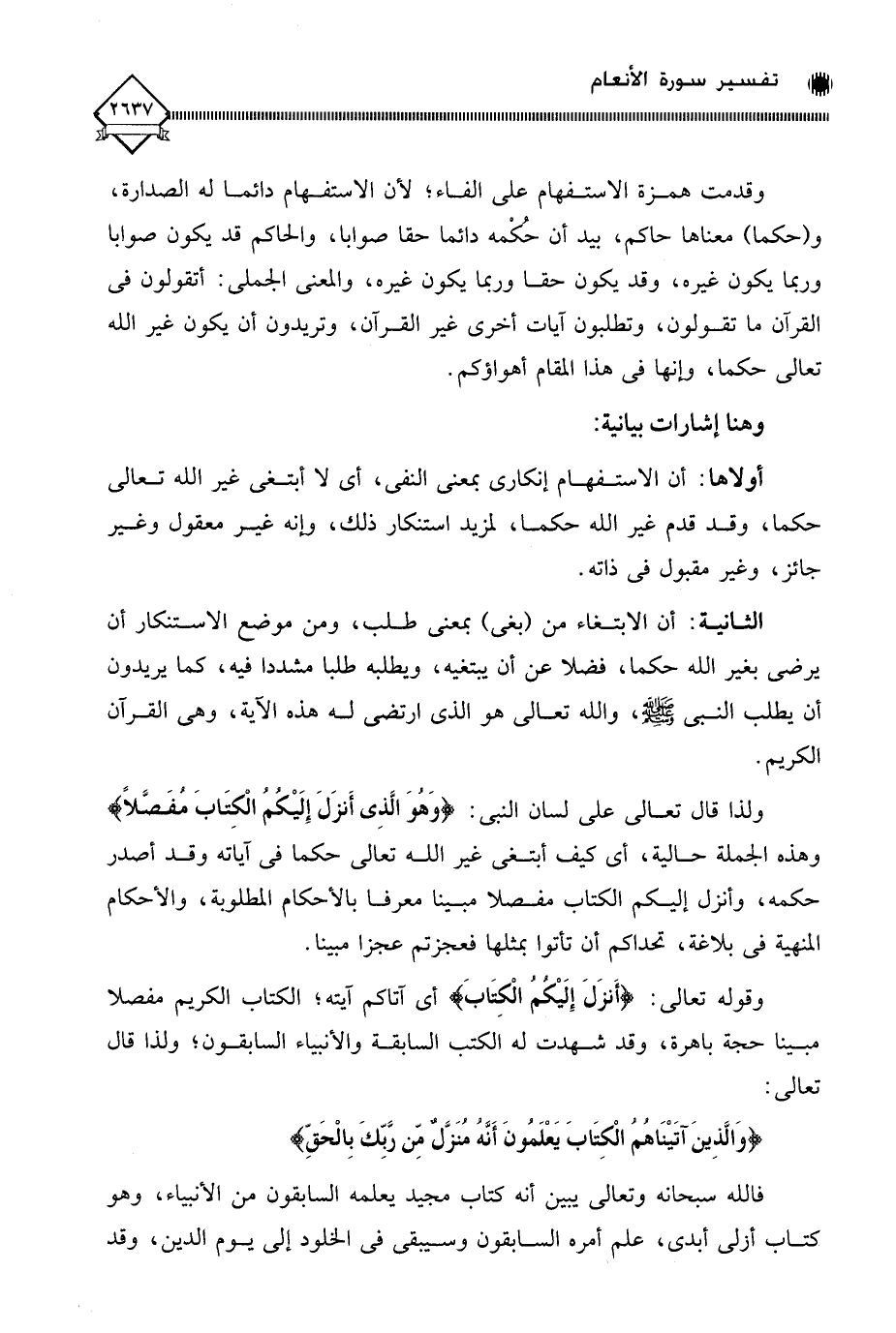 ولذا قال تعالى على لسان النبي: (وَهُوَ الَّذِى أَنزَلَ إِلَيْكُمُ الْكِتَابَ مفَصَّلًا) وهذه الجملة حالية، أي كيف أبتغي غير الله تعالى حكما في آياته وقد أصدر حكمه، وأنزل إليكم الكتاب مفصلا مبينا معرفا بالأحكام المطلوبة، والأحكام المنهية في بلاغة، تحداكم أن تأتوا بمثلها فعجزتم عجزا مبينا.