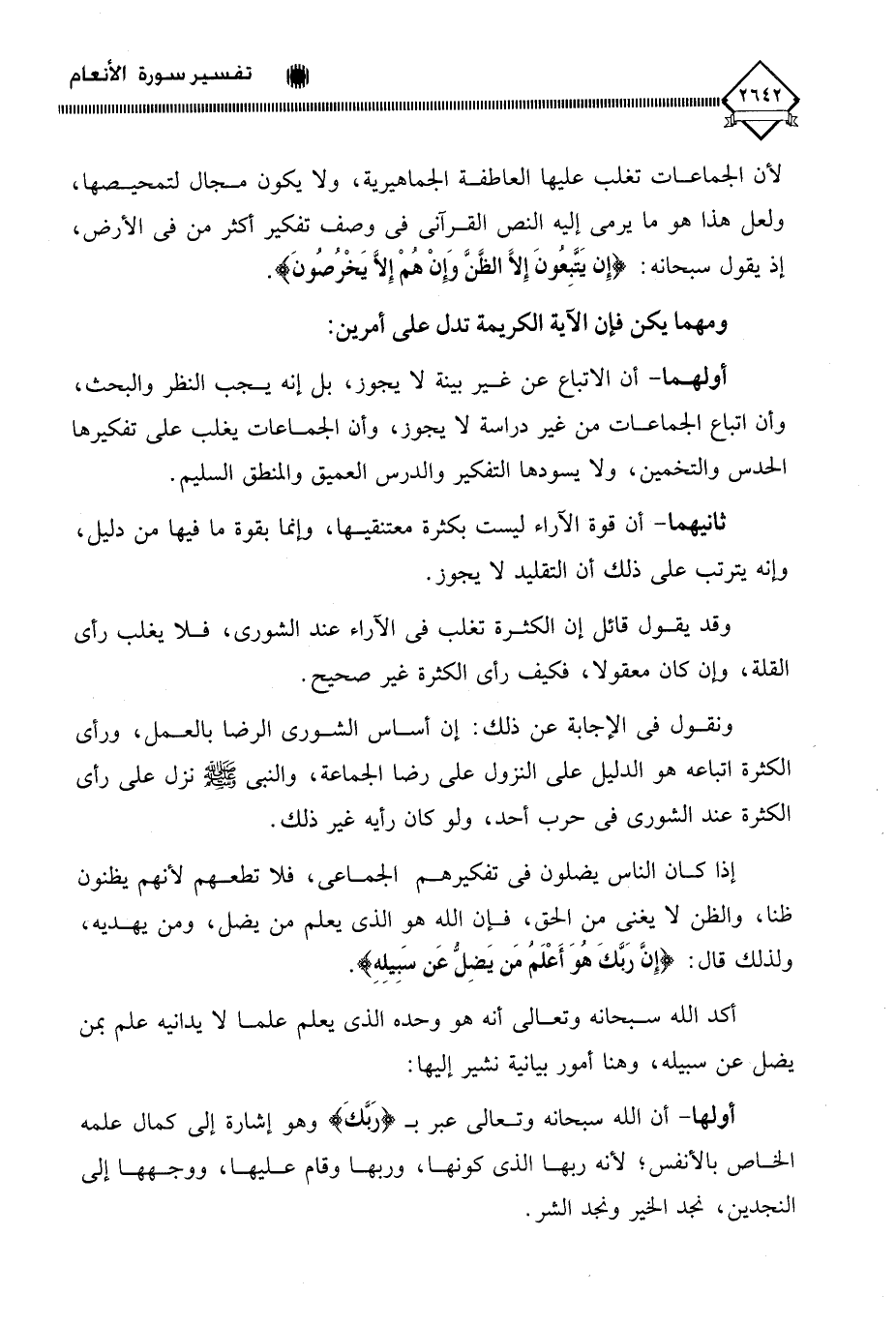 إذا كان الناس يضلون في تفكيرهم الجماعي، فلا تطعهم لأنهم يظنون ظنا، والظن لَا يغني من الحق، فإن الله هو الذي يعلم من يضل، ومن يهديه، ولذلك قال: