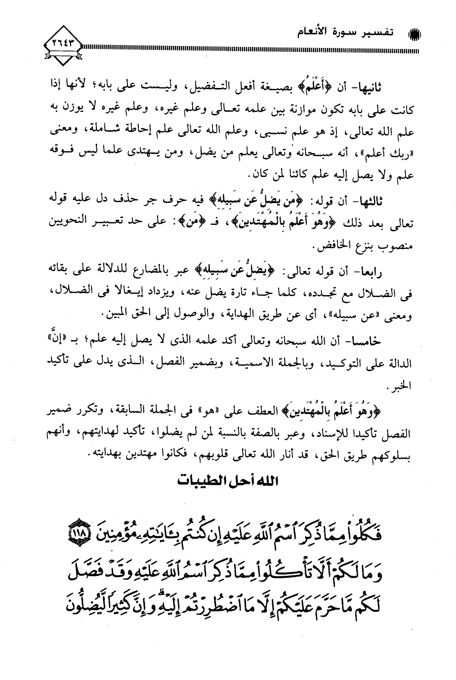 ثانيها - أن (أَعْلَمُ) بصيغة أفعل التفضيل، وليست على بابه؛ لأنها إذا كانت على بابه تكون موازنة بين علمه تعالى وعلم غيره، وعلم غيره لَا يوزن به علم الله تعالى، إذ هو علم نسبي، وعلم الله تعالى علم إحاطة شاملة، ومعنى " ربك أعلم "، أنه سبحانه وتعالى يعلم من يضل، ومن يهتدي علما ليس فوقه علم ولا يصل إليه علم كائنا لمن كان.
