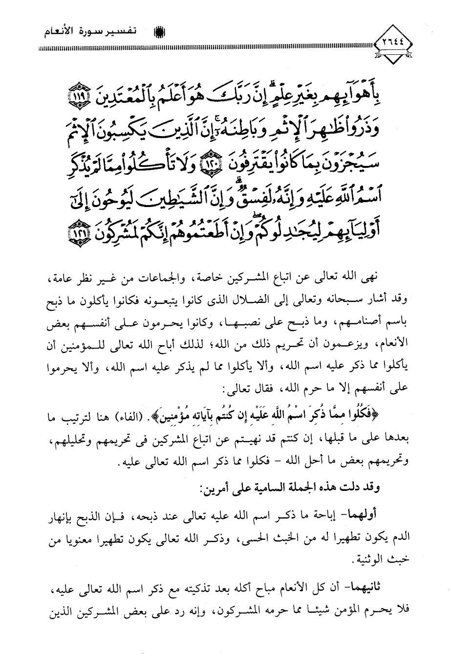 بِأَهْوَائِهِمْ بِغَيْرِ عِلْمٍ إِنَّ رَبَّكَ هُوَ أَعْلَمُ بِالْمُعْتَدِينَ (119) وَذَرُوا ظَاهِرَ الْإِثْمِ وَبَاطِنَهُ إِنَّ الَّذِينَ يَكْسِبُونَ الْإِثْمَ سَيُجْزَوْنَ بِمَا كَانُوا يَقْتَرِفُونَ (120) وَلَا تَأْكُلُوا مِمَّا لَمْ يُذْكَرِ اسْمُ اللَّهِ عَلَيْهِ وَإِنَّهُ لَفِسْقٌ وَإِنَّ الشَّيَاطِينَ لَيُوحُونَ إِلَى أَوْلِيَائِهِمْ لِيُجَادِلُوكُمْ وَإِنْ أَطَعْتُمُوهُمْ إِنَّكُمْ لَمُشْرِكُونَ (121)