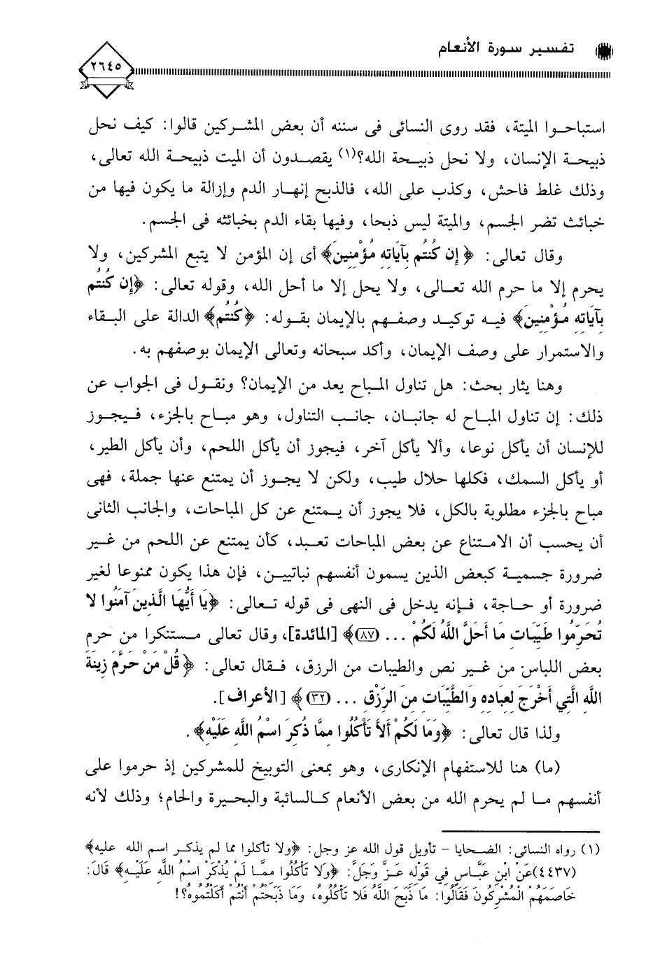 استباحوا الميتة، فقد روى النسائي في سننه أن بعض المشركين قالوا: كيف نحل ذبيحة الإنسان، ولا نحل ذبيحة الله؛ (¬1) يقصدون أن الميت ذبيحة الله تعالى، وذلك غلط فاحش، وكذب على الله، فالذبح إنهار الدم وإزالة ما يكون فيها من خبائث تضر الجسم، والميتة ليس ذبحا، وفيها بقاء الدم بخبائثه في الجسم. وقال تعالى: (إِن كُنتُم بِآيَاتِهِ مُؤْمِنِينَ) أي إن المؤمن لَا يتبع المشركين، ولا يحرم إلا ما حرَّم الله تعالى، ولا يحل إلا ما أحل الله، وقوله تعالى: (إِن كنتُم بِآيَاتِهِ مُؤْمِنِينَ) فيه توكيد وصفهم بالإيمان بقوله: (كُنتُم) الدالة على البقاء والاستمرار على وصف الإيمان، وأكد سبحانه وتعالى الإيمان بوصفهم به.