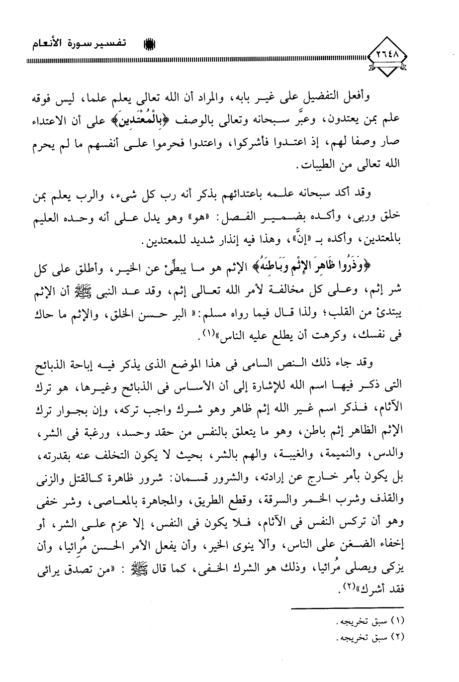 وقد جاء ذلك النص السامي في هذا الموضع الذي يذكر فيه إباحة الذبائح التي ذكر فيها اسم الله للإشارة إلى أن الأساس في الذبائح وغيرها، هو ترك الآثام، فذكر اسم غير الله إثم ظاهر وهو شرك واجب تركه، وإن بجوار ترك الإثم الظاهر إثم باطن، وهو ما يتعلق بالنفس من حقد وحسد، ورغبة في الشر، والدس، والنميمة، والغيبة، والهم بالشر، بحيث لَا يكون التخلف عنه بقدرته، بل يكون بأمر خارج عن إرادته، والشرور قسمان: شرور ظاهرة كالقتل والزنى والقذف وشرب الخمر والسرقة، وقطع الطريق، والمجاهرة بالمعاصي، وشر خفي وهو أن تركس النفس في الآثام، فلا يكون في النفس، إلا عزم على الشر، أو إخفاء الضغن على الناس، وألا ينوي الخير، وأن يفعل الأمر الحسن مُرِائيا، وأن يزكي ويصلي مُرائيا، وذلك هو الشرك الخفي، كما قال - صلى الله عليه وسلم -: " من تصدق يرائي فقد أشرك " (¬2).