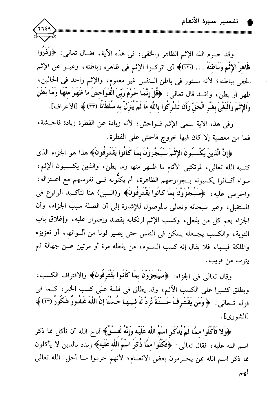 (إِنَّ الَّذِينَ يَكْسِبُونَ الإِثْمَ سَيُجْزَوْنَ بِمَا كَانُوا يَقْتَرِفُونَ) هذا هو الجزاء الذي كتبه الله تعالى، لمرتكبي الآثام ما ظهر منها وما بطن، والذين يكسبون الإثم، سواء أكانوا يكسبونه بجوارحهم الظاهرة، أم يكنُّونه في نفوسهم مع اعتزاله، والحرص عليه، (سَيُجْزَوْنَ بِمَا كَانُوا يَقْتَرِفُون) و (السين) هنا لتأكيد الوقوع في المستقبل، وعبر سبحانه وتعالى بالموصول للإشارة إلى أن الصلة سبب الجزاء، وأن الجزاء يعم كل من يفعل، وكسب الإثم ارتكابه بقصد وإصرار عليه، وإغلاف باب التوبة، والكسب يجعله يسكن في النفس حتى يصير لونا من ألوانها، أو تعزيزه والملكة فيها، فلا يقال إنه كسب السوء، من يفعله مرة أو مرتين عن جهالة ثم يتوب من قريب.