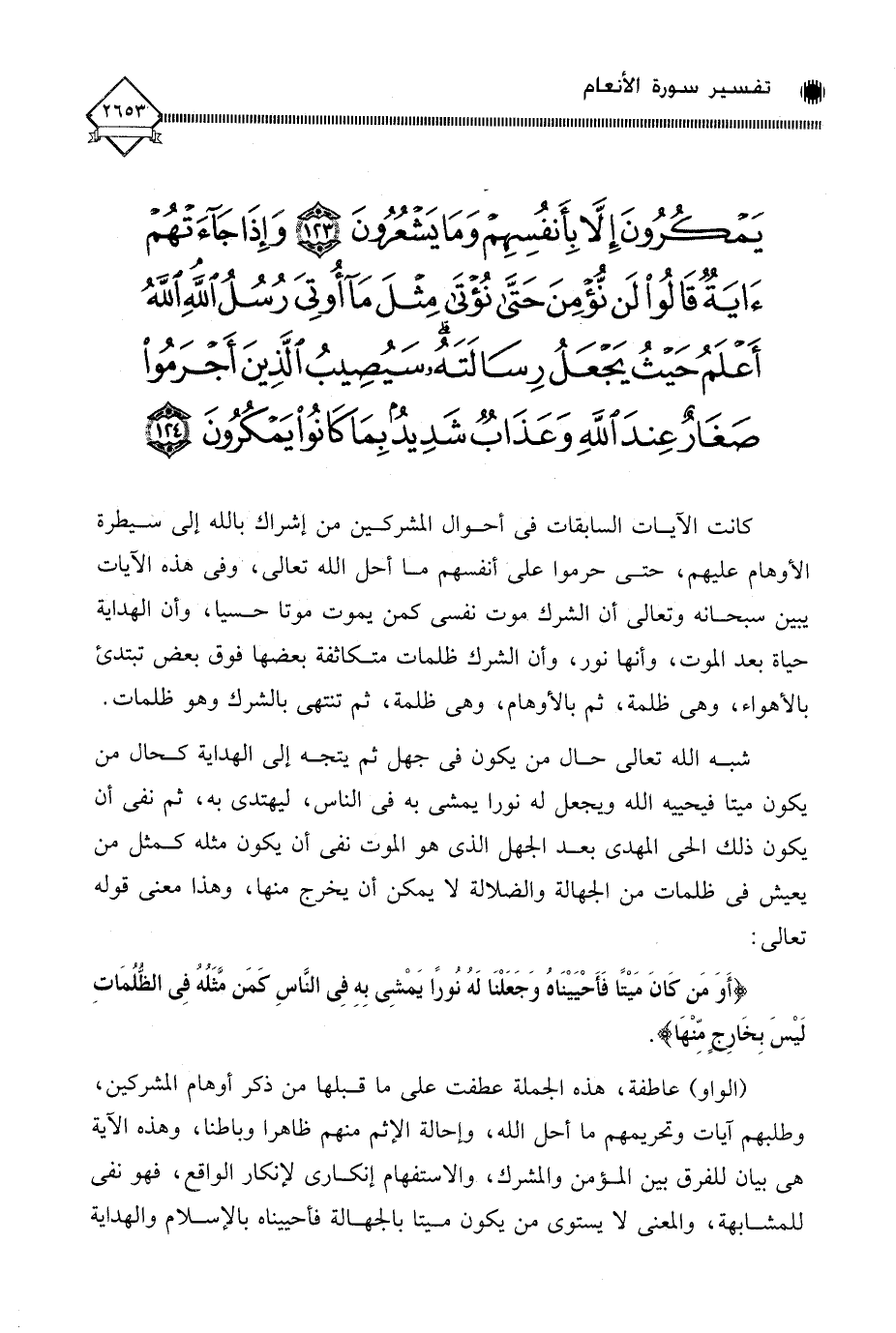 كانت الآيات السابقات في أحوال المشركين من إشراك بالله إلى سيطرة الأوهام عليهم، حتى حرموا على أنفسهم ما أحل الله تعالى، وفي هذه الآيات يبين سبحانه وتعالى أن الشرك موت نفسي كمن يموت موتا حسيا، وأن الهداية حياة بعد الموت، وأنها نور، وأن الشرك ظلمات متكاثفة بعضها فوق بعض تبتدئ بالأهواء، وهي ظلمة، ثم بالأوهام، وهي ظلمة، ثم تنتهي بالشرك وهو ظلمات.
