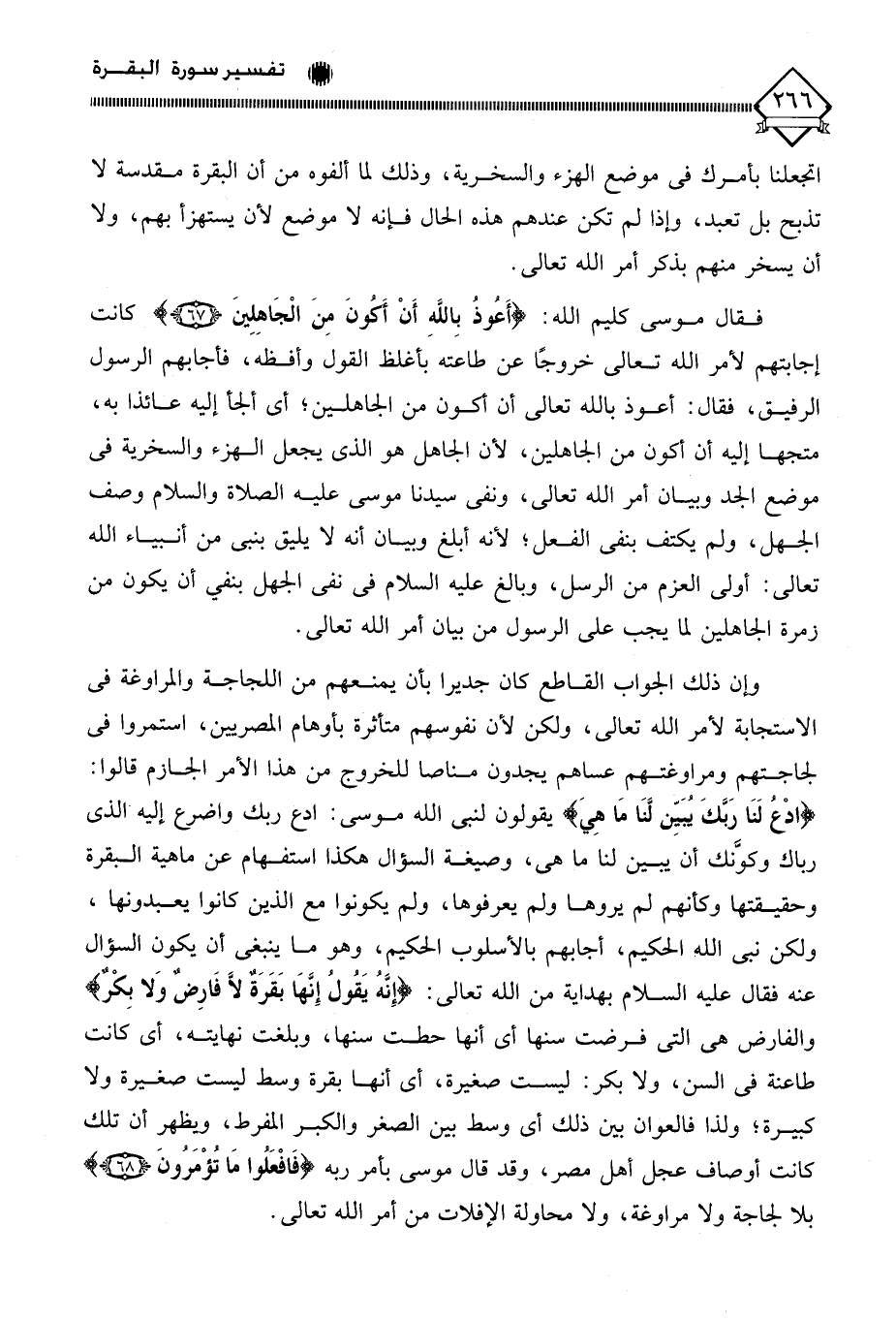 فقال موسى كليم الله: (أَعُوذُ بِاللَّهِ أَنْ أَكُونَ مِنَ الْجَاهِلِينَ) كانت إجابتهم لأمر الله تعالى خروجًا عن طاعته بأغلظ القول وأفظه، فأجابهم الرسول الرفيق، فقال: أعوذ بالله تعالى أن أكون من الجاهلين؛ أي ألجأ إليه عائذا به، متجها إليه أن أكون من الجاهلين، لأن الجاهل هو الذي يجعل الهزء والسخرية في موضع الجد وبيان أمر الله تعالى، ونفَى سيدنا موسى عليه الصلاة والسلام وصف الجهل، ولم يكتف بنفي الفعل؛ لأنه أبلغ وبيان أنه لَا يليق بنبي من أنبياء الله تعالى: أولي العزم من الرسل، وبالغ عليه السلام في نفي الجهل بنفي أن يكون من زمرة الجاهلين لما يجب على الرسول من بيان أمر الله تعالى.
