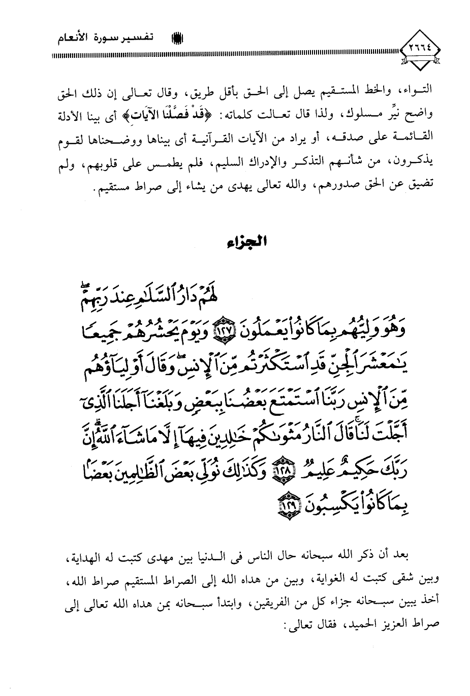 (لَهُمْ دَارُ السَّلَامِ عِنْدَ رَبِّهِمْ وَهُوَ وَلِيُّهُمْ بِمَا كَانُوا يَعْمَلُونَ (127) وَيَوْمَ يَحْشُرُهُمْ جَمِيعًا يَا مَعْشَرَ الْجِنِّ قَدِ اسْتَكْثَرْتُمْ مِنَ الْإِنْسِ وَقَالَ أَوْلِيَاؤُهُمْ مِنَ الْإِنْسِ رَبَّنَا اسْتَمْتَعَ بَعْضُنَا بِبَعْضٍ وَبَلَغْنَا أَجَلَنَا الَّذِي أَجَّلْتَ لَنَا قَالَ النَّارُ مَثْوَاكُمْ خَالِدِينَ فِيهَا إِلَّا مَا شَاءَ اللَّهُ إِنَّ رَبَّكَ حَكِيمٌ عَلِيمٌ (128) وَكَذَلِكَ نُوَلِّي بَعْضَ الظَّالِمِينَ بَعْضًا بِمَا كَانُوا يَكْسِبُونَ (129)