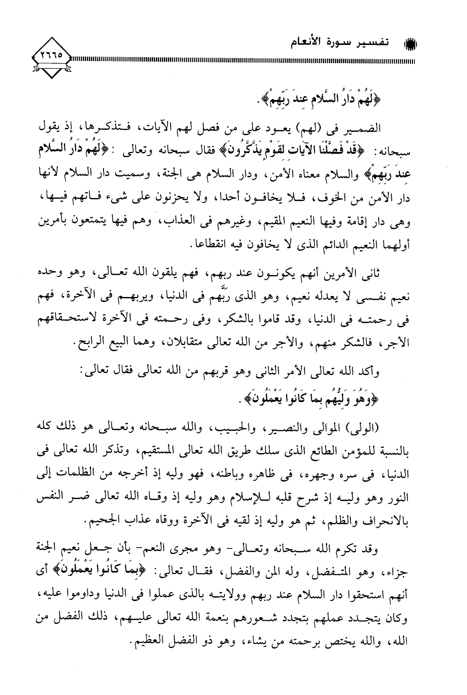 الضمير في (لهم) يعود على من فصل لهم الآيات، فتذكرها، إذ يقول سبحانه: (قَدْ فَصَّلْنَا الآيَاتِ لِقَوْمٍ يَذَّكَّرُونَ) فقال سبحانه وتعالى: (لَهُمْ دَارُ السَّلام عِندَ رَبِّهِمْ) والسلام معناه الأمن، ودار السلام هي الجنة، وسميت دار السلام لأنها دار الأمن من الخوف، فلا يخافون أحدا، ولا يحزنون على شيء فاتهم فيها، وهي دار إقامة وفيها النعيم المقيم، وغيرهم في العذاب، وهم فيها يتمتعون بأمرين أولهما النعيم الدائم الذي لَا يخافون فيه انقطاعا.