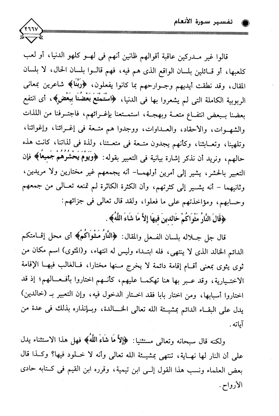 ولكنه قال سبحانه وتعالى مستثنيا: (إِلَّا مَا شَاءَ اللَّهُ) فهل هذا الاستثناء يدل على أن النار لها نهاية، تنتهي بمشيئة الله تعالى وأنه لَا خلود فيها؛ وكذا قال بعض العلماء ونسب هذا القول إلى ابن تيمية، وقرره ابن القيم في كتابه حادي الأرواح.