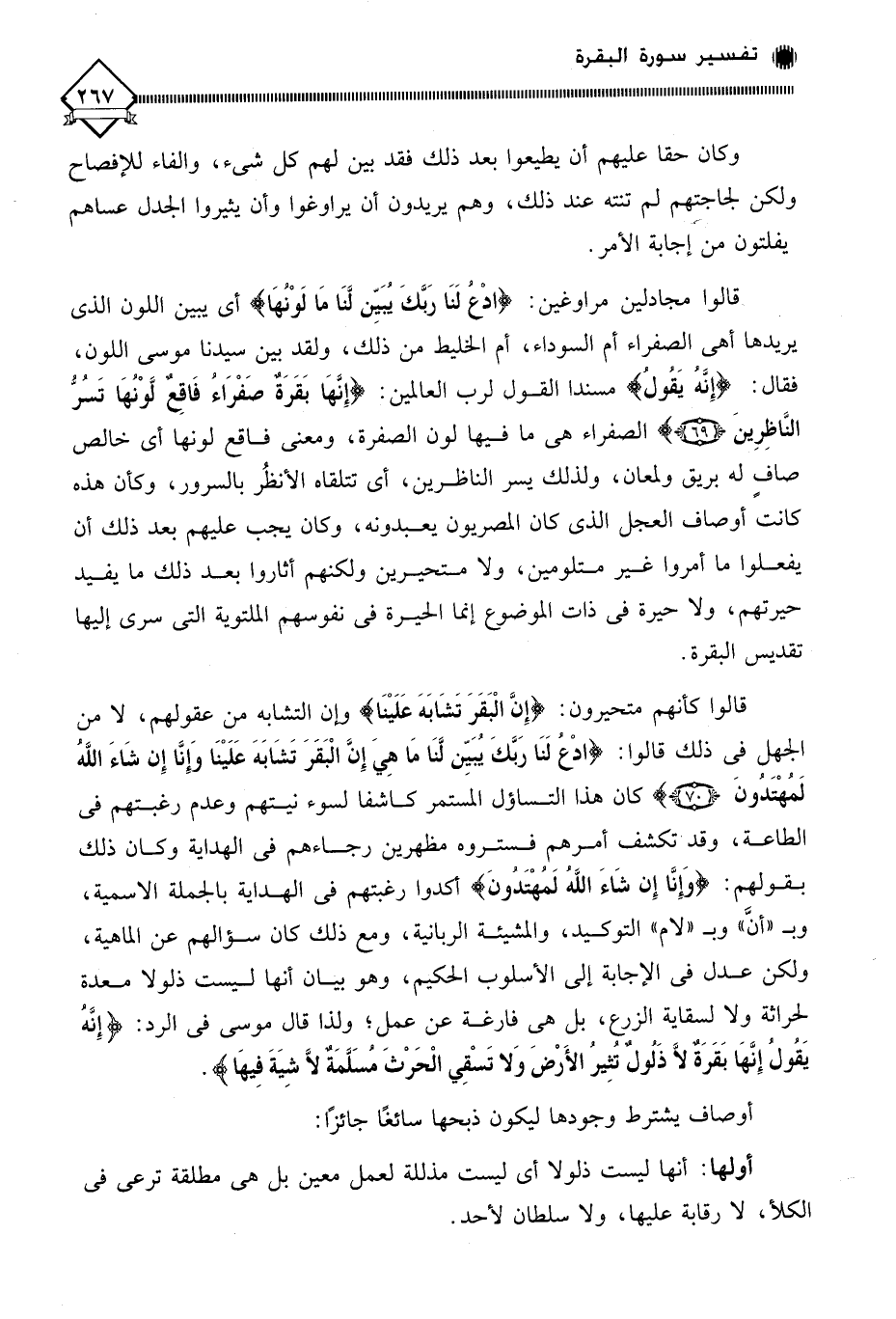 (إِنَّهُ يَقُولُ إِنَّهَا بَقَرَةٌ لَا ذَلُولٌ تُثِيرُ الْأَرْضَ وَلَا تَسْقِي الْحَرْثَ مُسَلَّمَةٌ لَا شِيَةَ فِيهَا ... (71)