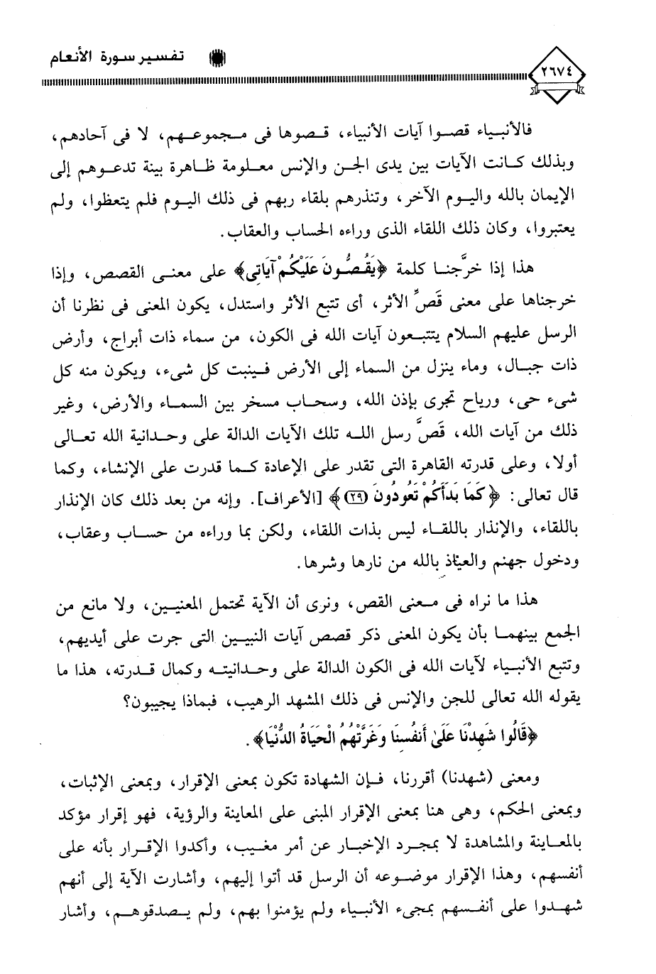 هذا ما نراه في معنى القص، ونرى أن الآية تحتمل المعنيين، ولا مانع من الجمع بينهما بأن يكون المعنى ذكر قصص آيات النبيين التي جرت على أيديهم، وتتبع الأنبياء لآيات الله في الكون الدالة على وحدانيته وكمال قدرته، هذا ما يقوله الله تعالى للجن والإنس في ذلك المشهد الرهيب، فبماذا يجيبون؟ (قَالُوا شَهِدْنَا عَلَى أَنفُسِنَا وَغَرَّتْهُمُ الْحَيَاةُ الدُّنْيَا).