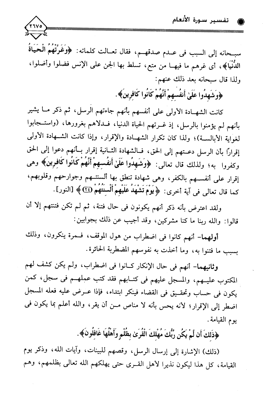 كانت الشهادة الأولى على أنفسهم بأنهم جاءتهم الرسل، ثم ذكر ما يشير بأنهم لم يؤمنوا بالرسل، إذ غرتهم الحياة الدنيا، فدلاهم بغرورها، (واستجابوا لغواية الأبالسة)؛ ولذا كان تكرار الشهادة والإقرار، وإذا كانت الشهادة الأولى إقرارًا بأن الرسل دعتهم إلى الحق، فالشهادة الثانية إقرار بأنهم دعوا إلى الحق وكفروا به، ولذلك قال تعالى: (وَشَهِدُوا عَلَى أَنفُسِهِمْ أَنَّهُمْ كانُوا كَافِرِينَ) وهي إقرار على أنفسهم بالكفر، وهي شهادة تنطق بها ألسنتهم وجوارحهم وقلوبهم، كما قال تعالى في آية أخرى: (يوْمَ تَشهَدُ عَلَيْهِمْ أَلْسِنَتُهُمْ).