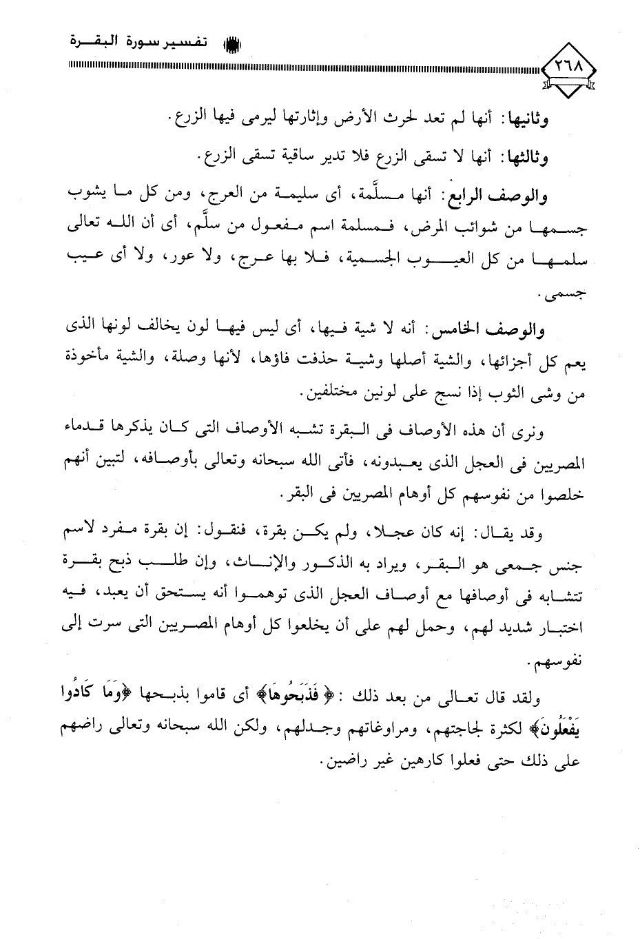 والوصف الرابع: أنها مسلَّمة، أي سليمة من العرج، ومن كل ما يشوب جسمها من شوائب المرض، فمسلمة اسم مفعول من سلَّم، أي أن الله تعالى سلمها من كل العيوب الجسمية، فلا بها عرج، ولا عور، ولا أي عيب جسمي.