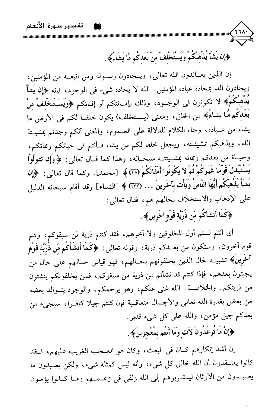 إن الذين يعاندون الله تعالى، ويحادون رسوله ومن اتبعه من المؤمنين، ويحادون الله بمحادة عباده المؤمنين. الله لَا يحاده شيء في الوجود، فإنه (إِنْ يَشَأْ يُذْهِبْكُمْ) لَا تكونون في الوجود، وذلك بإماتتكم أو إفنائكم (وَيَسْتَخْلِفْ مِنْ بَعْدِكُم مَّا يَشَاءُ) من الخلق، ومعنى (يستخلف) يكون خلفا لكم في الأرض ما يشاء من عباده، وجاء الكلام للدلالة على العموم، والمعنى أنكم وجدتم بمشيئة الله، ويذهبكم بمشيئته، وبجعل خلفا لكم من يشاء فأنتم في حياتكم ومماتكم، وحياة من بعدكم ومماته بمشيئته سبحانه، وهذا كما قال تعالى: (وَإِن تَتَولَّوْا يَسْتَبْدِلْ قَوْمًا غَيْرَكُمْ ثُمَّ لَا يَكُونُوا أَمْثَالَكُمْ). وكما قال تعالى: (إِن يَشَأ يُذْهِبْكُمْ أَيُّهَا النَّاسُ وَيَأتِ بِآخَرِينَ. . .)، وقد أقام سبحانه الدليل على الإذهاب والاستخلاف بحالهم هم، فقال تعالى: (كمَا أَنشَاكُم مِّن ذُرِّيَّةِ قَوْمٍ آخَرِينَ).