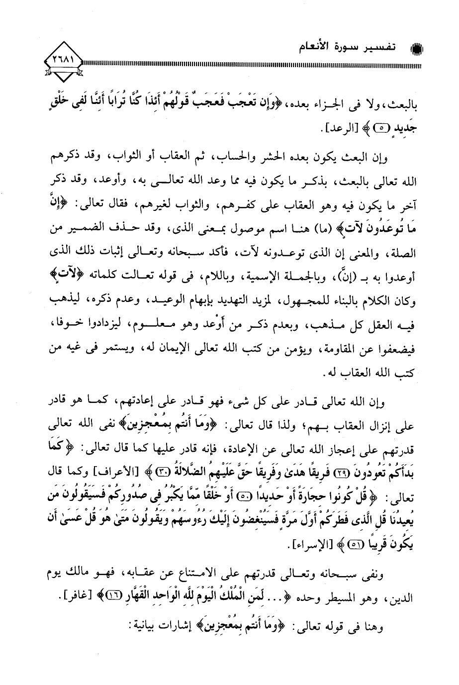 وإن الله تعالى قادر على كل شيء فهو قادر على إعادتهم، كما هو قادر على إنزال العقاب بهم؛ ولذا قال تعالى: (وَمَا أَنتُم بِمُعْجِزِينَ) نفَى الله تعالى قدرتهم على إعجاز الله تعالى عن الإعادة، فإنه قادر عليها كما قال تعالى: (كَمَا بَدَأَكُمْ تَعُودُونَ (29) فَرِيقًا هَدَى وَفَرِيقًا حَقَّ عَلَيْهِمُ الضَّلَالَةُ)، وكما قال تعالى: (قُلْ كُونُوا حِجَارَةً أَوْ حَدِيدًا (50) أَوْ خَلْقًا مِمَّا يَكْبُرُ فِي صُدُورِكُمْ فَسَيَقُولُونَ مَنْ يُعِيدُنَا قُلِ الَّذِي فَطَرَكُمْ أَوَّلَ مَرَّةٍ فَسَيُنْغِضُونَ إِلَيْكَ رُءُوسَهُمْ وَيَقُولُونَ مَتَى هُوَ قُلْ عَسَى أَنْ يَكُونَ قَرِيبًا (51).