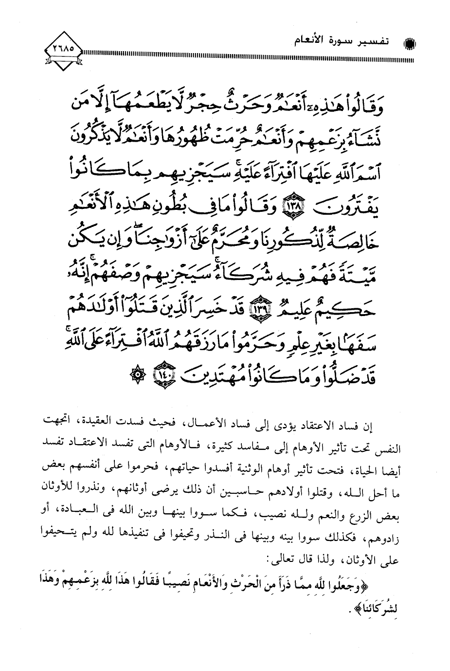 وَقَالُوا هَذِهِ أَنْعَامٌ وَحَرْثٌ حِجْرٌ لَا يَطْعَمُهَا إِلَّا مَنْ نَشَاءُ بِزَعْمِهِمْ وَأَنْعَامٌ حُرِّمَتْ ظُهُورُهَا وَأَنْعَامٌ لَا يَذْكُرُونَ اسْمَ اللَّهِ عَلَيْهَا افْتِرَاءً عَلَيْهِ سَيَجْزِيهِمْ بِمَا كَانُوا يَفْتَرُونَ (138) وَقَالُوا مَا فِي بُطُونِ هَذِهِ الْأَنْعَامِ خَالِصَةٌ لِذُكُورِنَا وَمُحَرَّمٌ عَلَى أَزْوَاجِنَا وَإِنْ يَكُنْ مَيْتَةً فَهُمْ فِيهِ شُرَكَاءُ سَيَجْزِيهِمْ وَصْفَهُمْ إِنَّهُ حَكِيمٌ عَلِيمٌ (139) قَدْ خَسِرَ الَّذِينَ قَتَلُوا أَوْلَادَهُمْ سَفَهًا بِغَيْرِ عِلْمٍ وَحَرَّمُوا مَا رَزَقَهُمُ اللَّهُ افْتِرَاءً عَلَى اللَّهِ قَدْ ضَلُّوا وَمَا كَانُوا مُهْتَدِينَ (140)