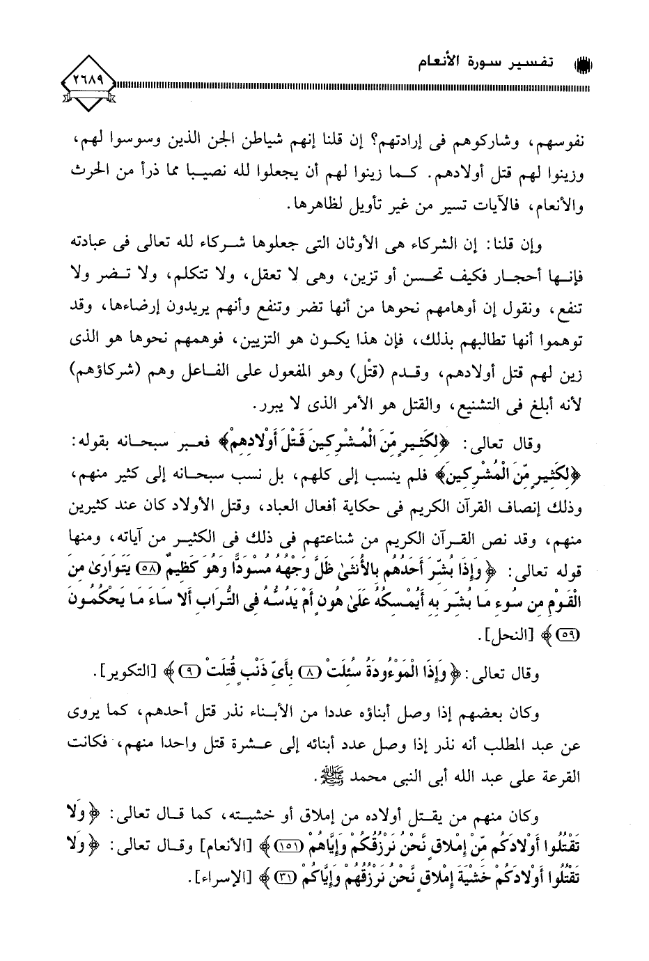 وقال تعالى: (لِكثِيرٍ منَ الْمُشْرِكِينَ قَتْلَ أَوْلادِهِمْ) فعبر سبحانه بقوله: (لِكَثِيرٍ منَ الْمُشْرِكِينَ) فلم ينسب إلى كلهم، بل نسب سبحانه إلى كثير منهم، وذلك إنصاف القرآن الكريم في حكاية أفعال العباد، وقتل الأولاد كان عند كثيرين منهم، وقد نص القرآن الكريم من شناعتهم في ذلك في الكثير من آياته، ومنها قوله تعالى: (وَإِذَا بُشِّرَ أَحَدُهُمْ بِالْأُنْثَى ظَلَّ وَجْهُهُ مُسْوَدًّا وَهُوَ كَظِيمٌ (58) يَتَوَارَى مِنَ الْقَوْمِ مِنْ سُوءِ مَا بُشِّرَ بِهِ أَيُمْسِكُهُ عَلَى هُونٍ أَمْ يَدُسُّهُ فِي التُّرَابِ أَلَا سَاءَ مَا يَحْكُمُونَ (59).