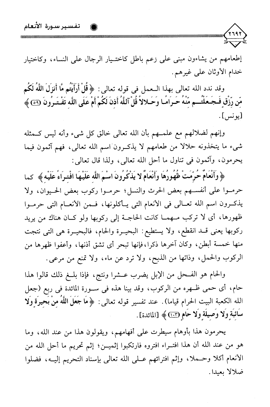 (وَأَنْعَامٌ حُرِّمَتْ ظُهُورُهَا وَأَنْعَامٌ لَا يَذْكرُونَ اسْمَ اللَّهِ عَلَيْهَا افْتِرَاءً عَلَيْهِ) كما حرموا على أنفسهم بعض الحرث والنسل؛ حرموا ركوب بعض الحيوان، ولا يذكرون اسم الله تعالى في الأنعام التي يأكلونها، فمن الأنعام التي حرموا ظهورها، أي لَا تركب مهما كانت الحاجة إلى ركوبها ولو كان هناك من يريد ركوبها يعني قد انقطع، ولا يستطيع: البحيرة والحام، فالبحيرة هي التي نتجت منها خمسة أبطن، وكان آخرها ذكرا، فإنها تبحر أي تشق أذنها، وأعفوا ظهرها من الركوب والحمل، وذاتها من الذبح، ولا ترد عن ماء، ولا تمنع من مرعى.