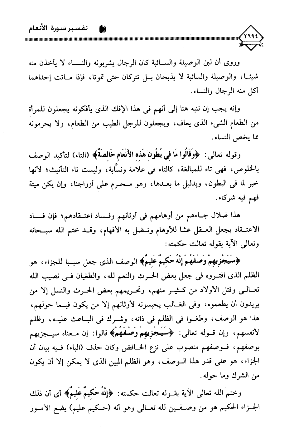 (سَيَجْزِيهِمْ وَصْفَهُمْ إِنَّهُ حَكِيمٌ عَلِيمٌ) الوصف الذي جعل سببا للجزاء، هو الظلم الذي افتروه في جعل بعض الحرث والنعم لله، والطغيان في نصيب الله تعالى وقتل الأولاد من كثير منهم، وتحريمهم بعض الحرث والنسل إلا من يريدون أن يطعموه، وفي الغالب يحبسونه لأوثانهم إلا من يكون فيما حولهم، هذا هو الوصف، وطغوا في الظلم في ذاته، وشرك في الباعث عليه، وظلم لأنفسهم، وإن قوله تعالى: (سَيجْزِيهِمْ وَصْفَهُمْ) قالوا: إن معناه سيجزيهم بوصفهم، فوصفهم منصوب على نزع الخافض وكان حذف (الباء) فيه بيان أن الجزاء، هو على قدر هذا الوصف، وهو الظلم المبين الذي لَا يمكن إلا أن يكون من الشرك وما حوله.