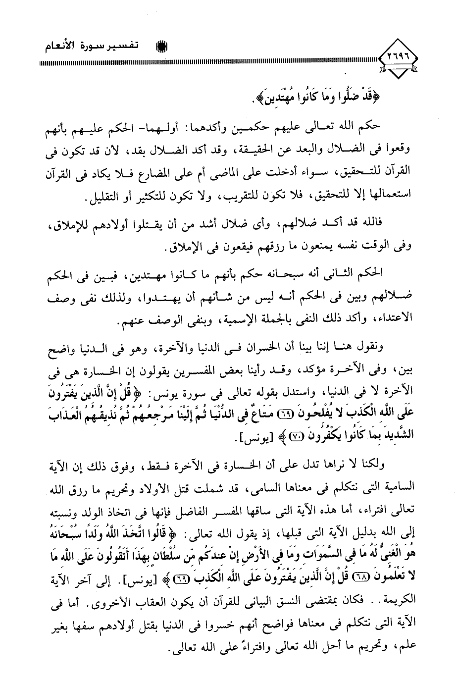 ولكنا لَا نراها تدل على أن الخسارة في الآخرة فقط، وفوق ذلك إن الآية السامية التي نتكلم في معناها السامي، قد شملت قتل الأولاد وتحريم ما رزق الله تعالى افتراء، أما هذه الآية التي ساقها المفسر الفاضل فإنها في اتخاذ الولد ونسبته إلى الله بدليل الآية التي قبلها، إذ يقول الله تعالى: (قَالُوا اتَّخَذَ اللَّهُ وَلَدًا سُبْحَانَهُ هُوَ الْغَنِيُّ لَهُ مَا فِي السَّمَاوَاتِ وَمَا فِي الْأَرْضِ إِنْ عِنْدَكُمْ مِنْ سُلْطَانٍ بِهَذَا أَتَقُولُونَ عَلَى اللَّهِ مَا لَا تَعْلَمُونَ (68) قُلْ إِنَّ الَّذِينَ يَفْتَرُونَ عَلَى اللَّهِ الْكَذِبَ ... )، إلى آخر الآية الكريمة. .