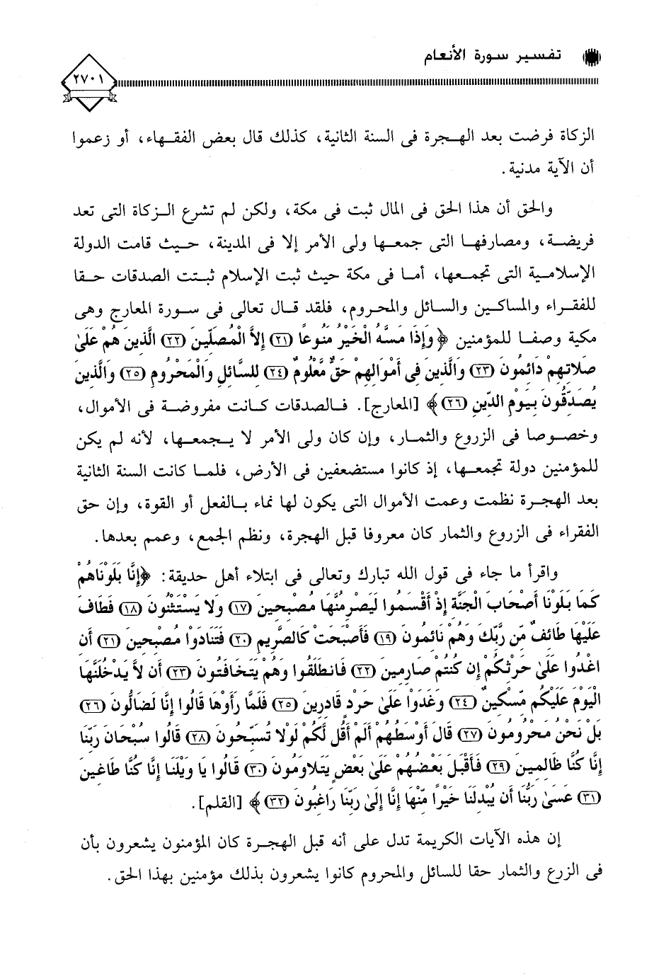 إن هذه الآيات الكريمة تدل على أنه قبل الهجرة كان المؤمنون يشعرون بأن في الزرع والثمار حقا للسائل والمحروم كانوا يشعرون بذلك مؤمنين بهذا الحق.