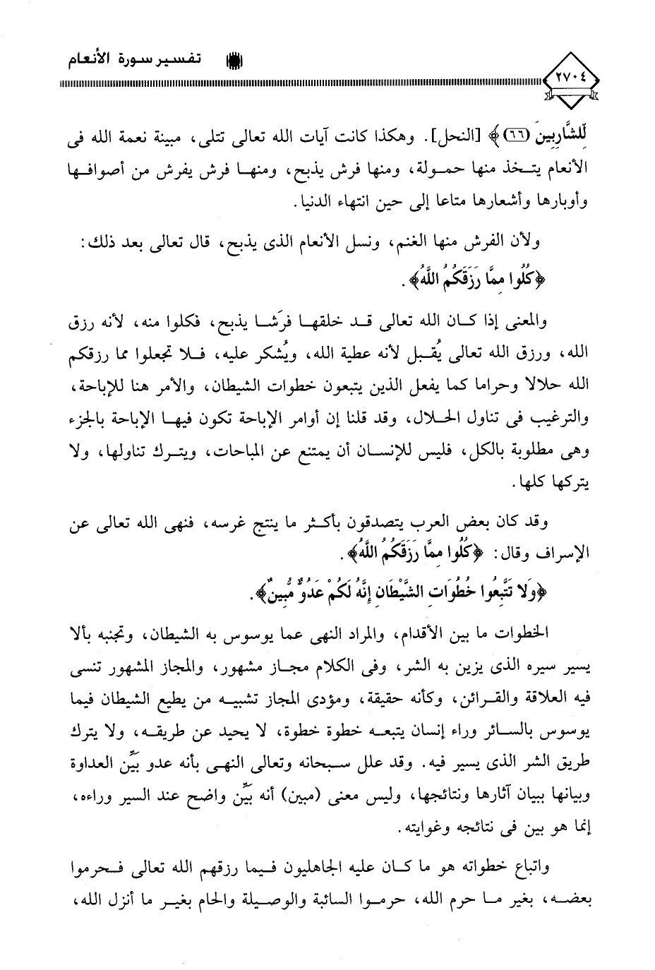 لِلشَّارِبِينَ)، وهكذا كانت آيات الله تعالى تتلى، مبينة نعمة الله في الأنعام يتخذ منها حمولة، ومنها فرش يذبح، ومنها فرش يفرش من أصوافها وأوبارها وأشعارها متاعا إلى حين انتهاء الدنيا.