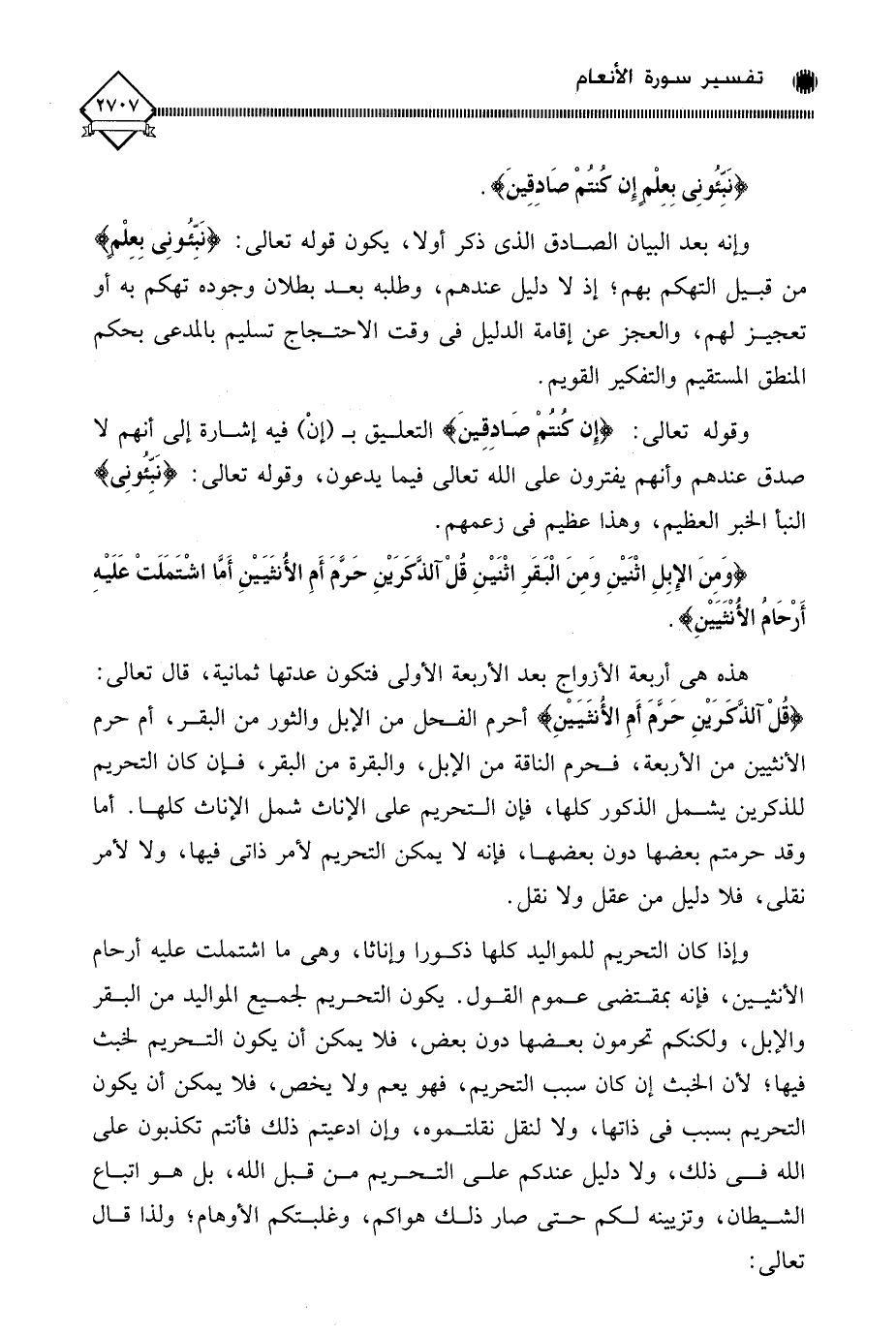 هذه هي أربعة الأزواج بعد الأربعة الأولى فتكون عدتها ثمانية، قال تعالى: (قُلْ آلذَّكَرَيْنِ حَرَّمَ أَمِ الأنثَيَيْنِ) أحرم الفحل من الإبل والثور من البقر، أم حرم الأنثيين من الأربعة، فحرم الناقة من الإبل، والبقرة من البقر، فإن كان التحريم للذكرين يشمل الذكور كلها، فإن التحريم على الإناث شمل الإناث كلها. أما وقد حرمتم بعضها دون بعضها، فإنه لَا يمكن التحريم لأمر ذاتي فيها، ولا لأمر نقلي، فلا دليل من عقل ولا نقل.