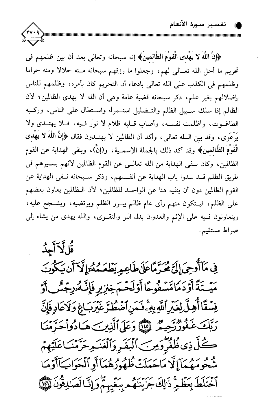 (قُلْ لَا أَجِدُ فِي مَا أُوحِيَ إِلَيَّ مُحَرَّمًا عَلَى طَاعِمٍ يَطْعَمُهُ إِلَّا أَنْ يَكُونَ مَيْتَةً أَوْ دَمًا مَسْفُوحًا أَوْ لَحْمَ خِنْزِيرٍ فَإِنَّهُ رِجْسٌ أَوْ فِسْقًا أُهِلَّ لِغَيْرِ اللَّهِ بِهِ فَمَنِ اضْطُرَّ غَيْرَ بَاغٍ وَلَا عَادٍ فَإِنَّ رَبَّكَ غَفُورٌ رَحِيمٌ (145) وَعَلَى الَّذِينَ هَادُوا حَرَّمْنَا كُلَّ ذِي ظُفُرٍ وَمِنَ الْبَقَرِ وَالْغَنَمِ حَرَّمْنَا عَلَيْهِمْ شُحُومَهُمَا إِلَّا مَا حَمَلَتْ ظُهُورُهُمَا أَوِ الْحَوَايَا أَوْ مَا اخْتَلَطَ بِعَظْمٍ ذَلِكَ جَزَيْنَاهُمْ بِبَغْيِهِمْ وَإِنَّا لَصَادِقُونَ (146)