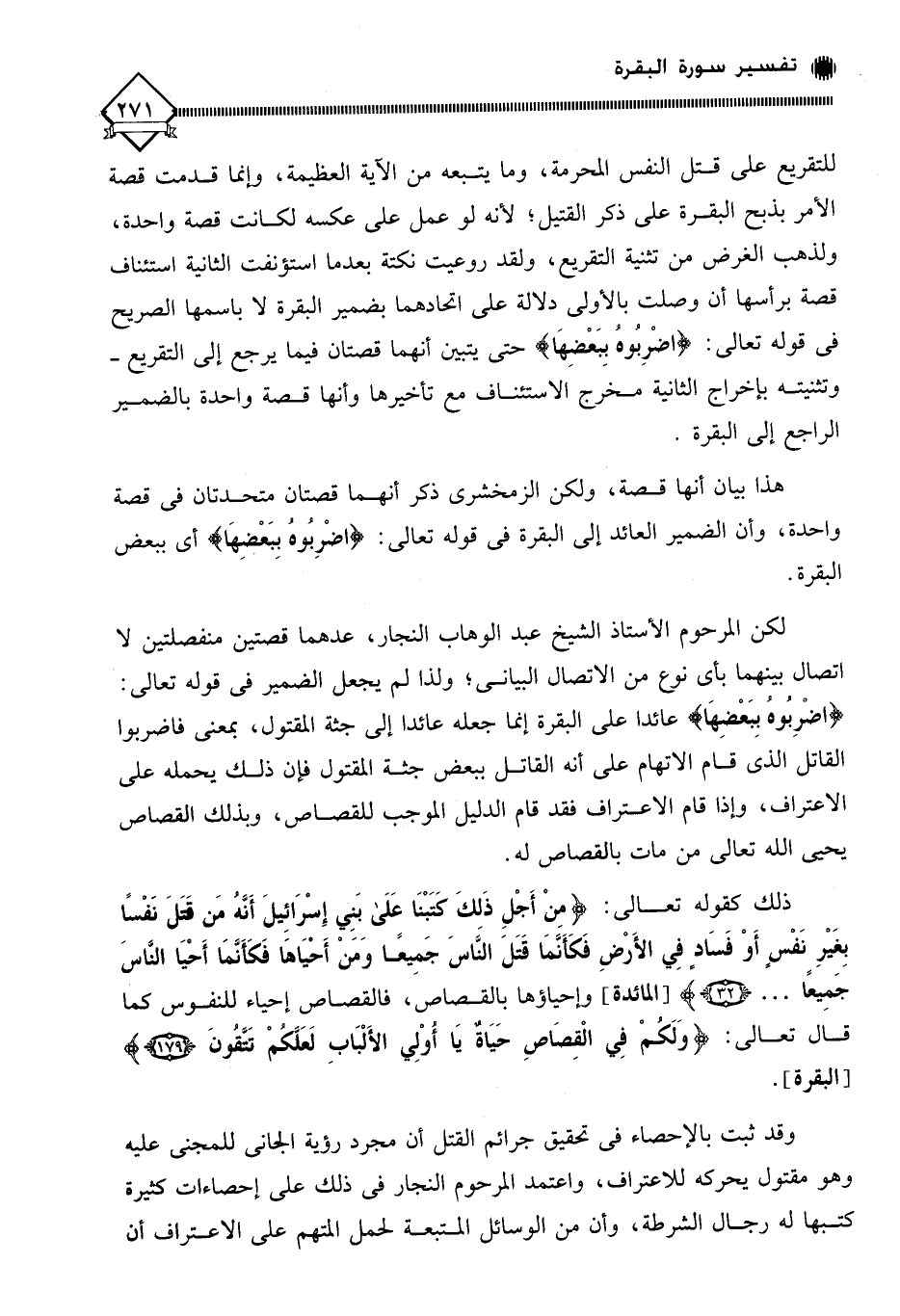لكن المرحوم الأستاذ الشيخ عبد الوهاب النجار، عدهما قصتين منفصلتين لا اتصال بينهما بأي نوع من الاتصال البياني؛ ولذا لم يجعل الضمير في قوله تعالى: (اضْرِبُوهُ بِبَعْضِهَا) عائدا على البقرة إنما جعله عائدا إلى جثة المقتول، بمعنى فاضربوا القاتل الذي قام الاتهام على أنه القاتل ببعض جثة المقتول فإن ذلك يحمله على الاعتراف، وإذا قام الاعتراف فقد قام الدليل الموجب للقصاص، وبذلك القصاص يحي الله تعالى من مات بالقصاص له.