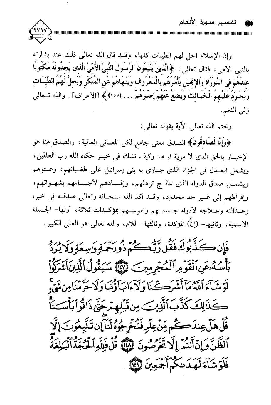 (فَإِنْ كَذَّبُوكَ فَقُلْ رَبُّكُمْ ذُو رَحْمَةٍ وَاسِعَةٍ وَلَا يُرَدُّ بَأْسُهُ عَنِ الْقَوْمِ الْمُجْرِمِينَ (147) سَيَقُولُ الَّذِينَ أَشْرَكُوا لَوْ شَاءَ اللَّهُ مَا أَشْرَكْنَا وَلَا آبَاؤُنَا وَلَا حَرَّمْنَا مِنْ شَيْءٍ كَذَلِكَ كَذَّبَ الَّذِينَ مِنْ قَبْلِهِمْ حَتَّى ذَاقُوا بَأْسَنَا قُلْ هَلْ عِنْدَكُمْ مِنْ عِلْمٍ فَتُخْرِجُوهُ لَنَا إِنْ تَتَّبِعُونَ إِلَّا الظَّنَّ وَإِنْ أَنْتُمْ إِلَّا تَخْرُصُونَ (148) قُلْ فَلِلَّهِ الْحُجَّةُ الْبَالِغَةُ فَلَوْ شَاءَ لَهَدَاكُمْ أَجْمَعِينَ (149)