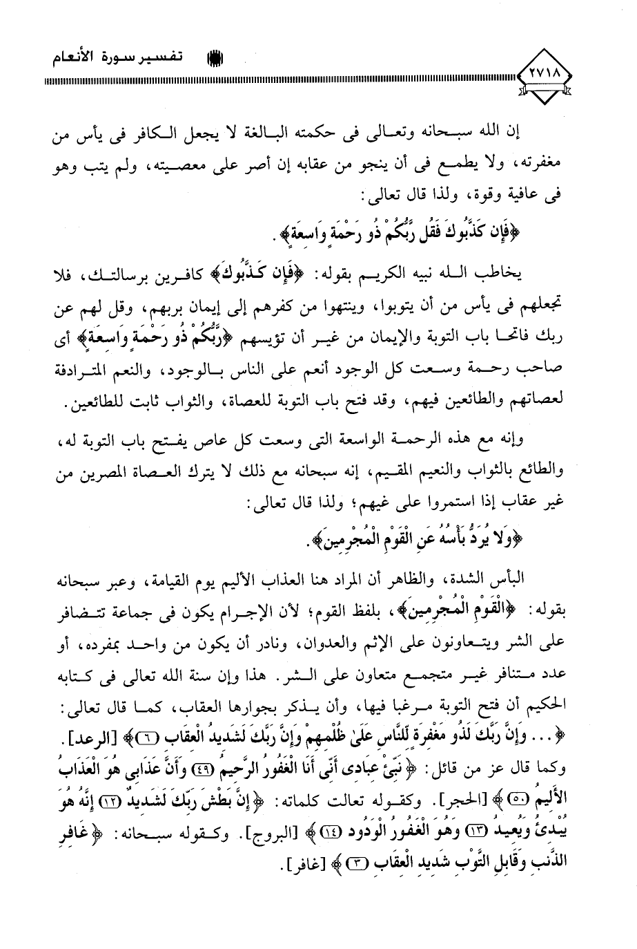 يخاطب الله نبيه الكريم بقوله: (فَإِن كذَّبُوكَ) كافرين برسالتك، فلا تجعلهم في يأس من أن يتوبوا، وينتهوا من كفرهم إلى إيمان بربهم، وقل لهم عن ربك فاتحا باب التوبة والإيمان من غير أن تؤيسهم (رَبُكمْ ذُو رَحْمَةٍ وَاسِعَة) أي صاحب رحمة وسعت كل الوجود أنعم على الناس بالوجود، والنعم المترادفة لعصاتهم والطائعين فيهم، وقد فتح باب التوبة للعصاة، والثواب ثابت للطائعين. وإنه مع هذه الرحمة الواسعة التي وسعت كل عاص يفتح باب التوبة له، والطائع بالثواب والنعيم المقيم، إنه سبحانه مع ذلك لَا يترك العصاة المصرين من غير عقاب إذا استمروا على غيهم؛ ولذا قال تعالى:
